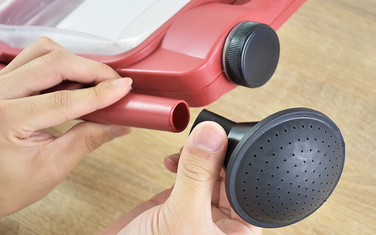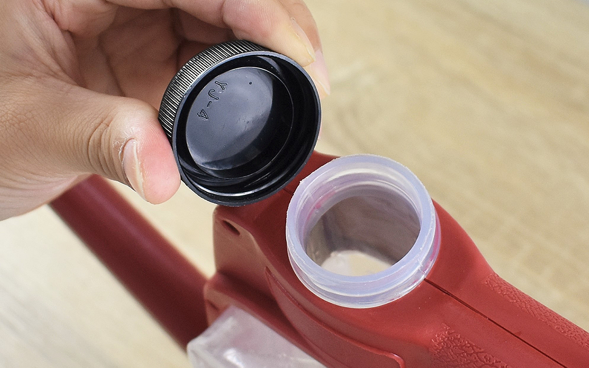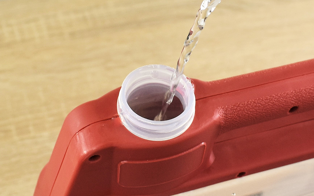 ノズルの先端にジョウロのパーツを取りつけたら、タンク上部にある注ぎ口から水を注入。柔らかいポリタンクは水を入れれば膨らむため、最大で6Lの水を溜めることが可能です。