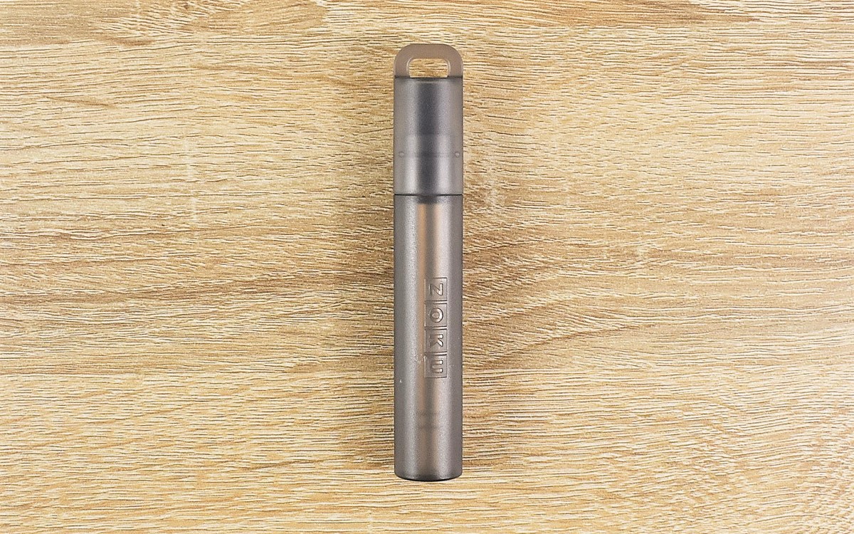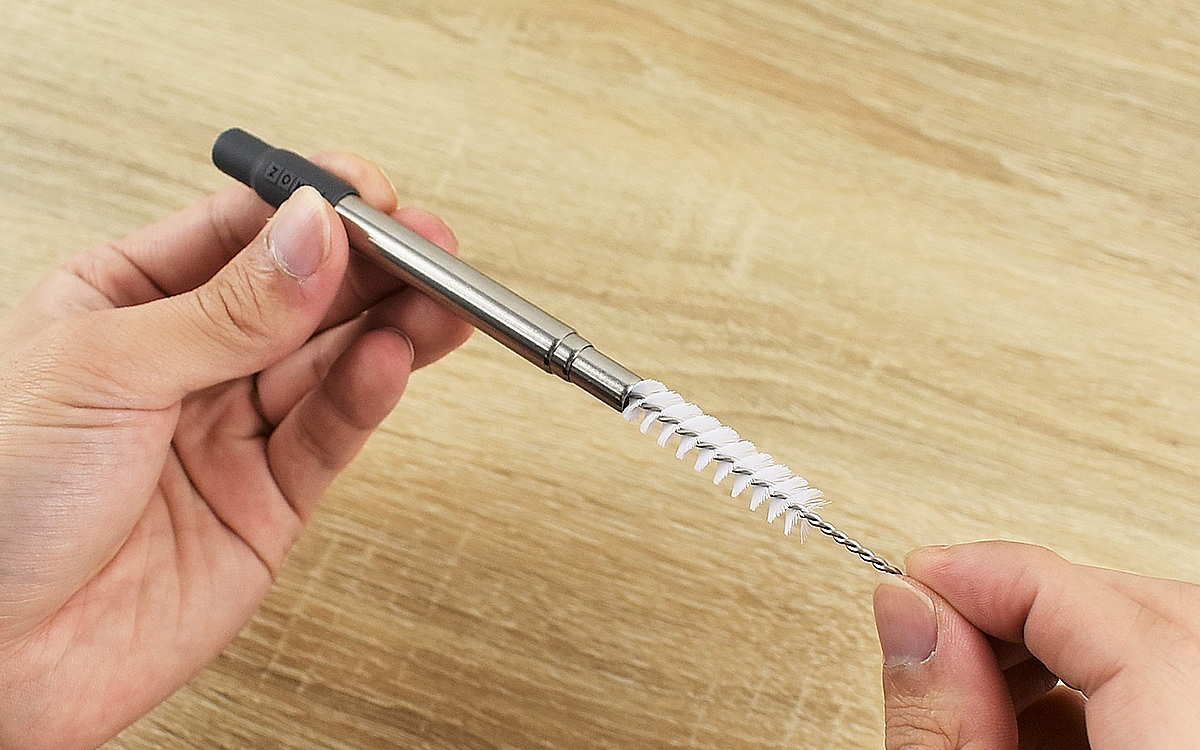 1.8(直径)×11.5cm(長さ)ほどの小さなケースに入った同商品。ケースを開けると、中には長さ10cmほどに折りたたまれたステンレス製のストローと専用ブラシが入っています。