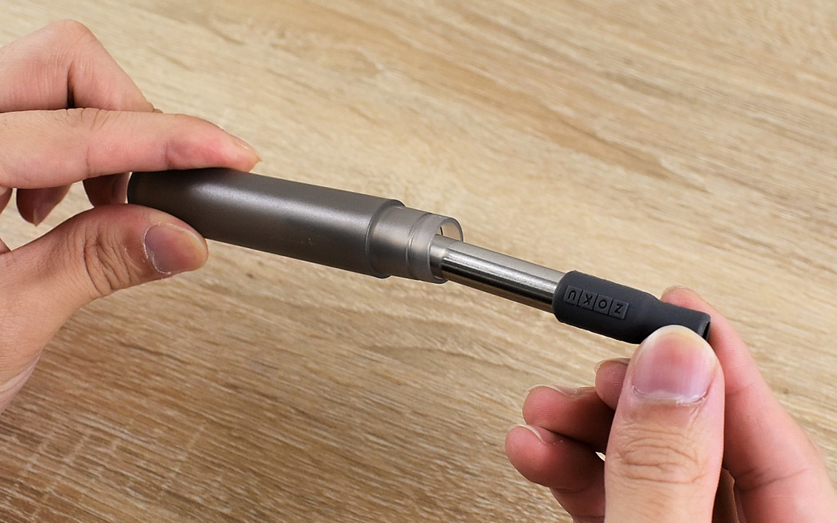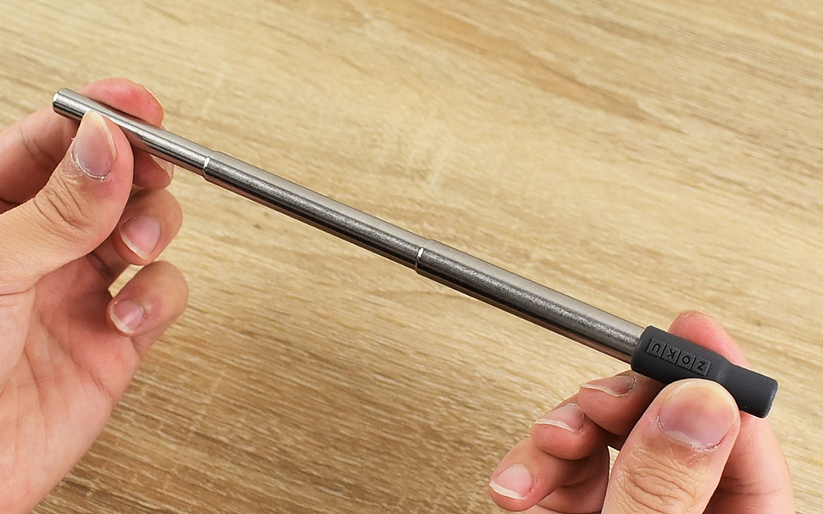 両端を持ってゆっくり引き出すと、1.0(直径)×23cm(長さ)ほどのストローに。飲み口の部分はシリコン製のカバーで覆われているため、金属部分を直接くわえずに飲むことができますよ。
