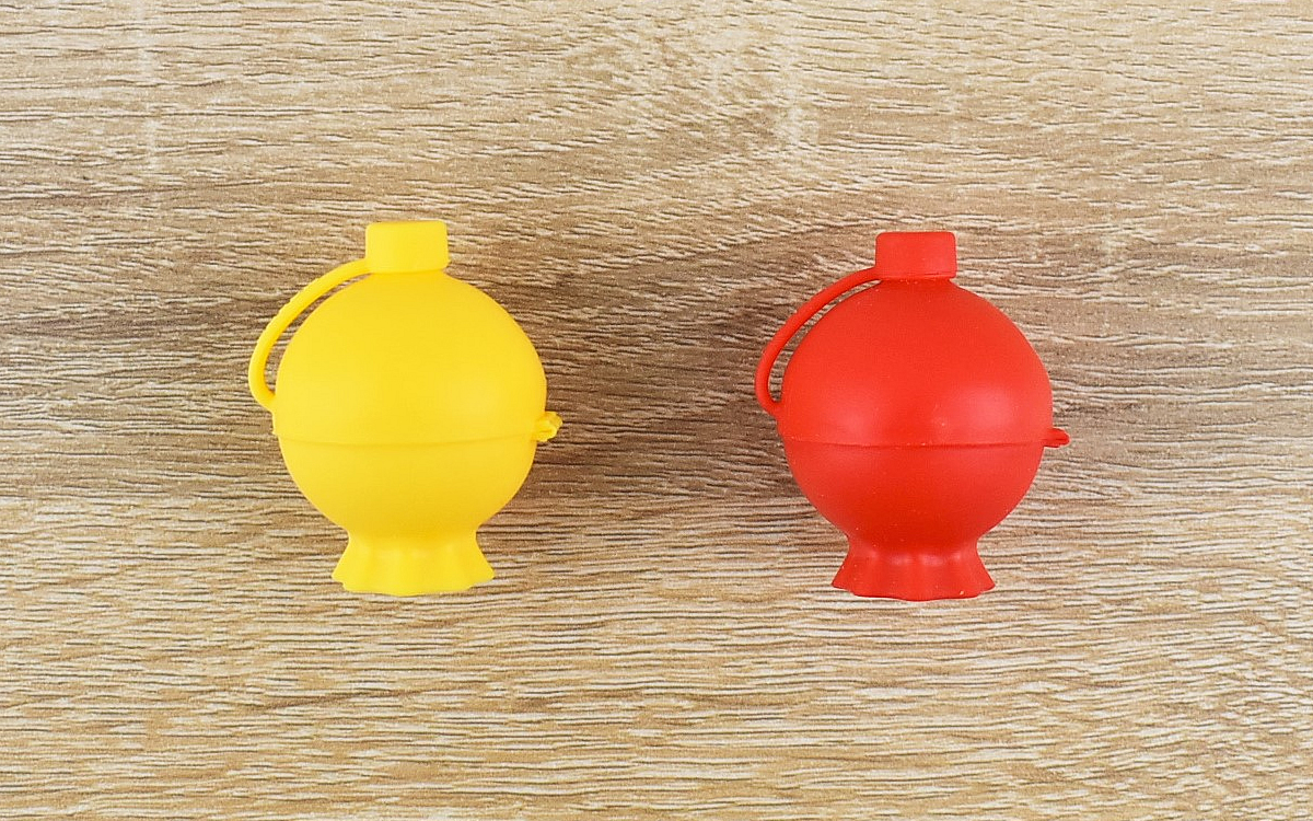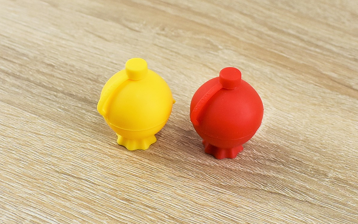 赤と黄色のシリコン製ボトルがセットになった同商品。大きさはそれぞれ約36(高さ)×42(幅)×32mm(奥行)ほどで、おかずの隙間に入れても邪魔になりません。