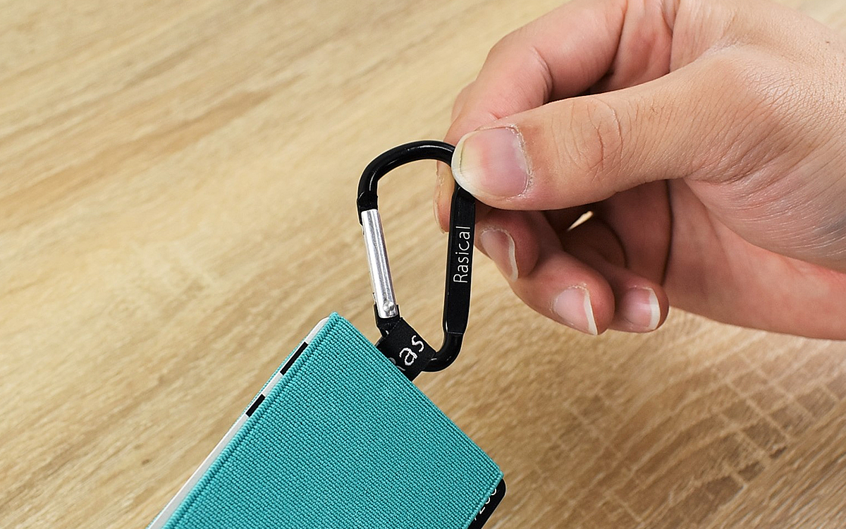 極限までミニマムサイズを追求した財布は、大きさ約50(縦)×90(横)×3mm(厚さ)ほど。重さもおよそ14gと軽量で、服のポケットに入れてもモノが入っていることを感じさせません。ここまで小さいと落とさないか不安になる人もいると思いますが、同商品にはカラビナが付属。ベルトループなどに引っかければ安心して持ち運ぶことができますよ。