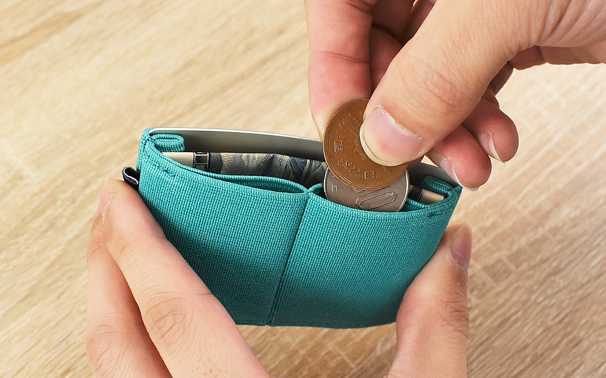 さらに、コンパクトながら機能性も充実。カードや紙幣を入れられるメインポケットに加え、外側にはコイン用の小さなポケットがついています。普通の財布に比べれば入る量は少ないですが、スッキリとした財布内は見やすさ抜群。よく会計時にカードが見つからなくて焦りやすい私にとっては、うれしい作りでした。