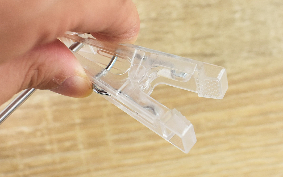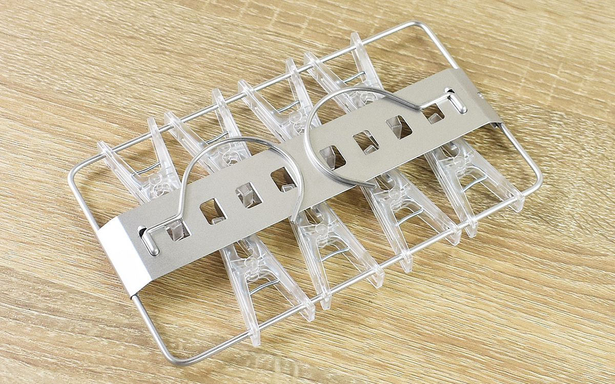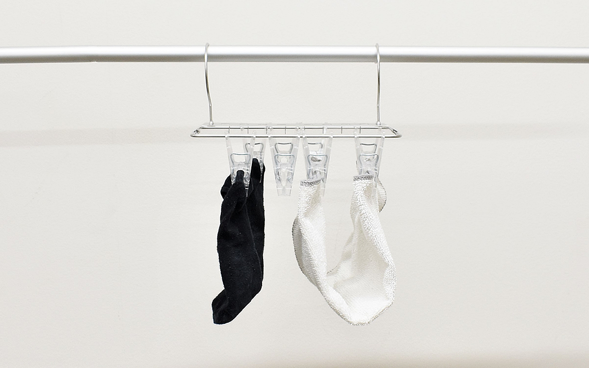 洗濯バサミが8個ついたハンガーは、約12(縦)×20cm(横)ほどと超ミニサイズ。両手分くらいの大きさなので、洗濯物を部屋干しする際も場所をとりません。おでかけ用としてはもちろん、狭い部屋に住んでいる人にとっても助かる仕様ですね。