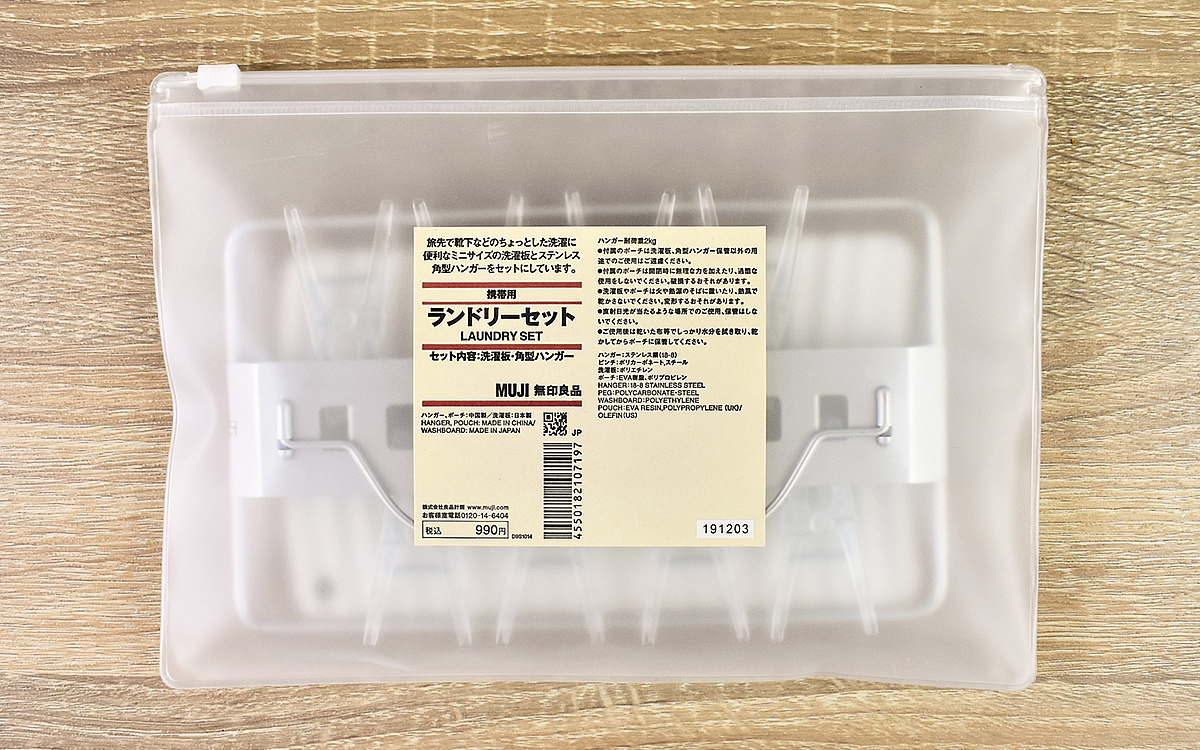 先日出張に行った際、うっかりYシャツに食事をこぼしてしまいシミが……。その時はホテルのコインランドリーを使ったものの、シャツ1枚のために洗濯代を払うのは少々気が引けました。そこで、外出先でも簡単に洗濯ができる商品をネットで検索。無印良品の通販サイトで見つけたのが、持ち運びしやすいサイズの「携帯用ランドリーセット 洗濯板・ミニ角型ハンガー」(990円/税込)です。