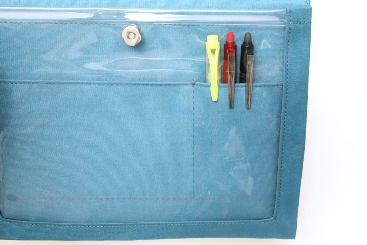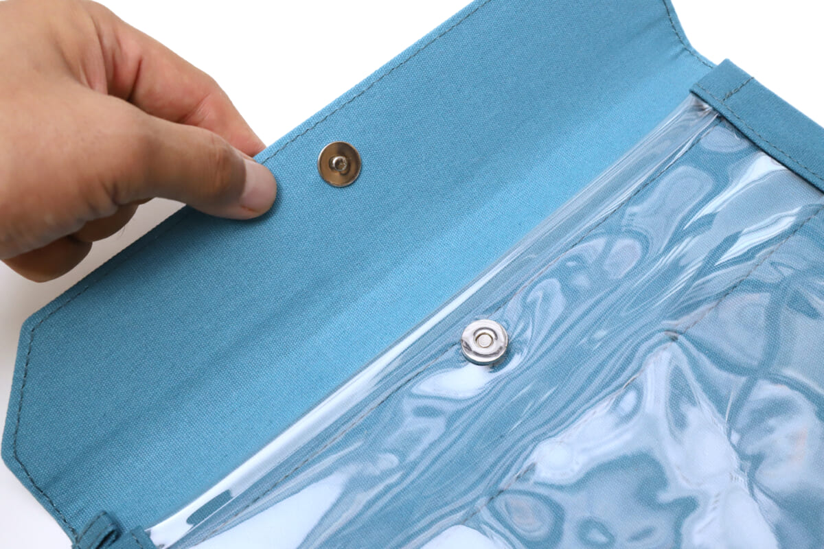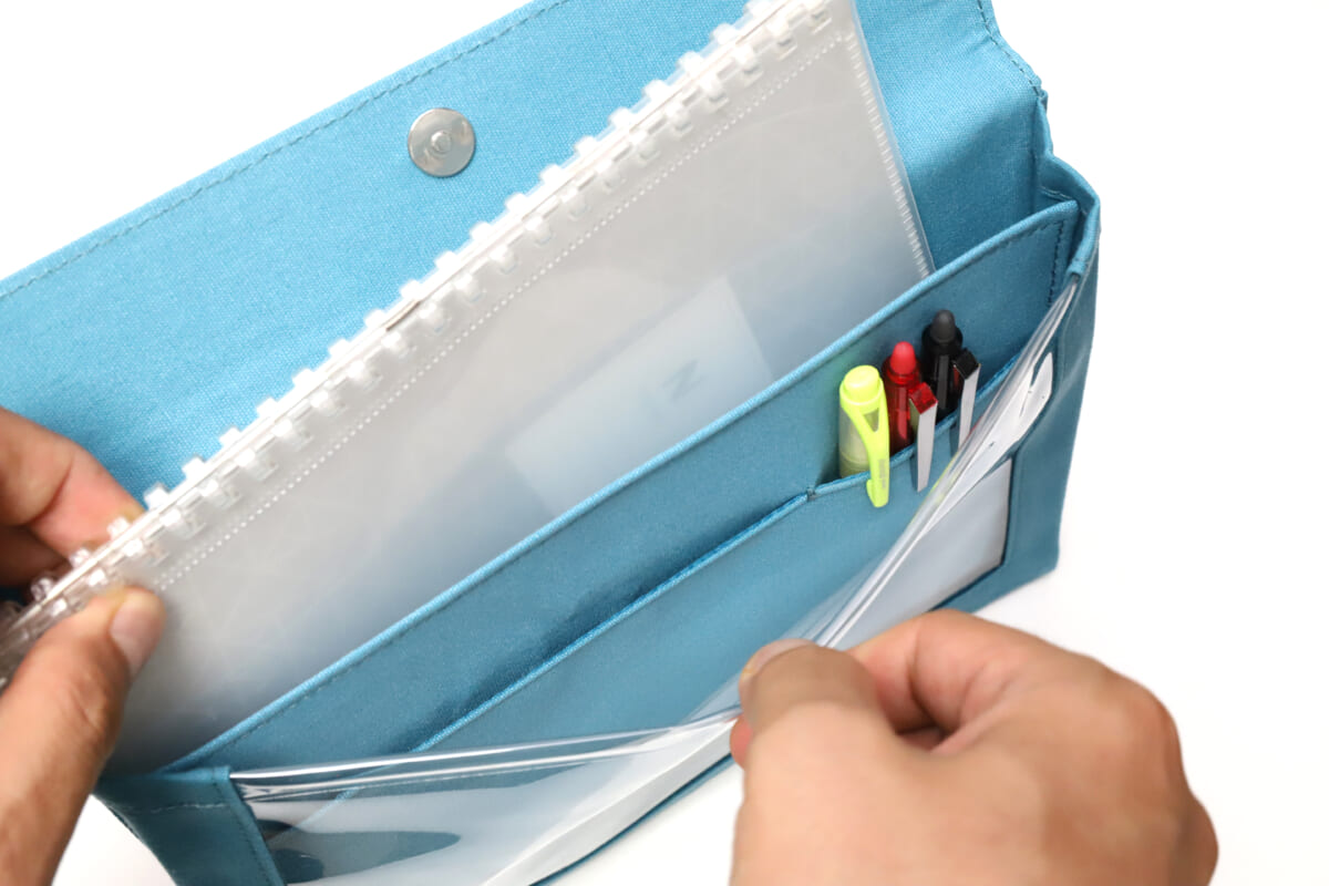 内部は、間に内ポケット付きの仕切り板を挟んだ2室構造となっている。ごちゃっとした小物は見通しの良い前(透明ポケット)側のポケット、薄い紙モノなどは後ろ側のポケット、と使い分けると整理しやすいだろう。