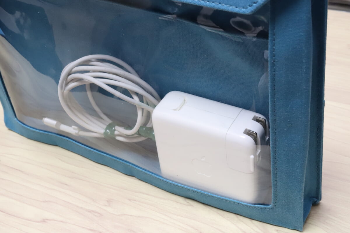 まずマチの厚みだが、同じA5サイズで比較すると「フラッティ」のマチ約20mmに対して「ワークス」は約35mm。厚みが15mm変われば収納力はそもそも大きく変わるし、なにより、入るモノ自体が違ってくる。例えばMacBookの電源アダプターは厚みが約28mmだが、「ワークス」ならこれぐらいすんなりと飲み込んでしまう。つまり、バッグインバッグとしての利便性に差が出るわけだ。