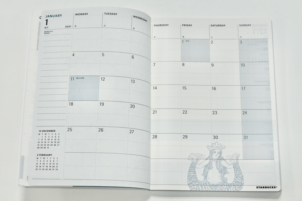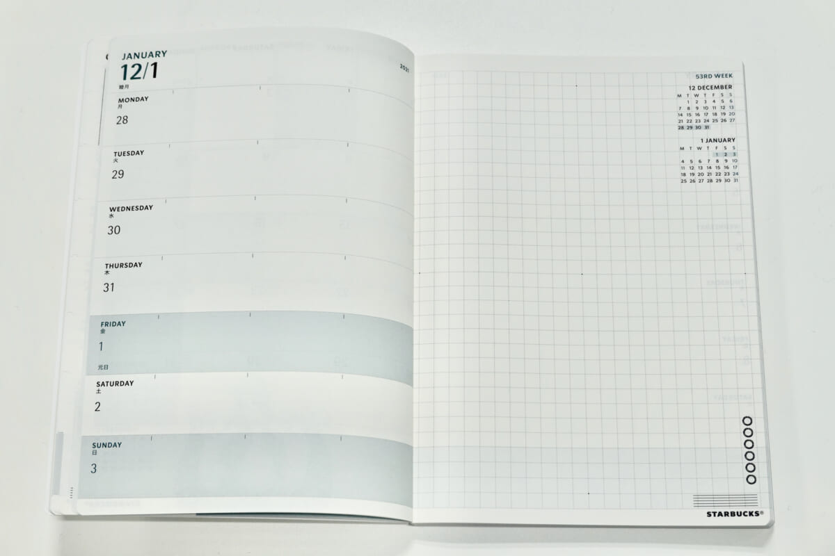 スケジュールブックのフォーマットは、マンスリーページと、右ページに方眼のメモを備えた週間レフト式を収録。いずれも月曜始まりで、日本の曜日・祝日の表記にも対応しています。