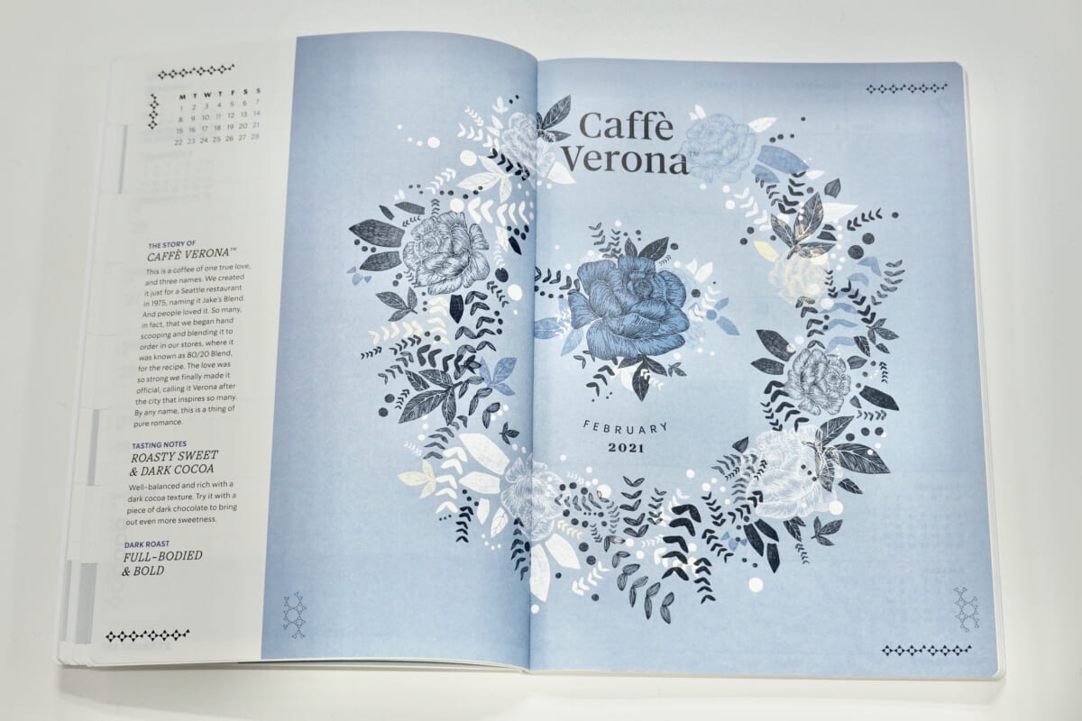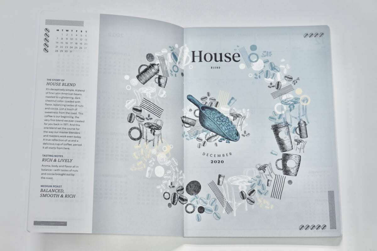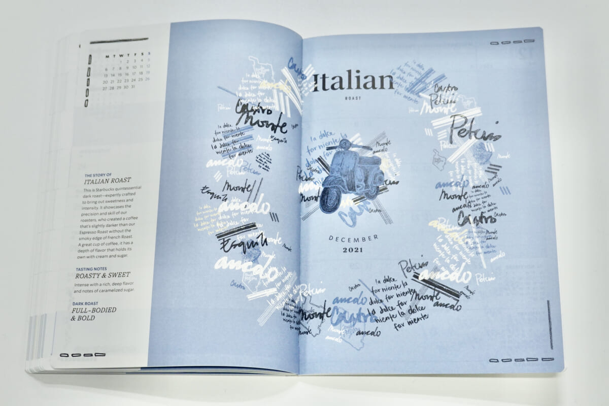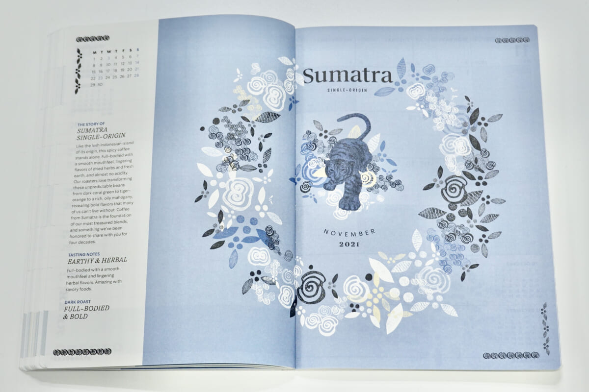各月の扉には、スターバックスが製造・販売しているコーヒー豆のパッケージデザインをモチーフとしたイラストが描かれ、その脇にはコーヒーストーリー、キーワードと味わいの特徴が記されています。2020年12月から2021年12月まで、一つずつ見ていきましょう。
