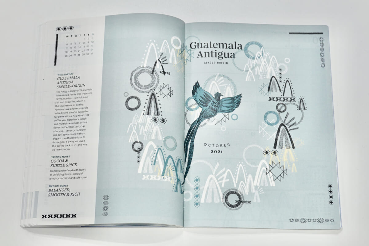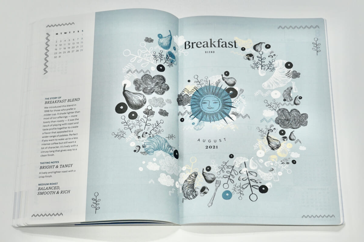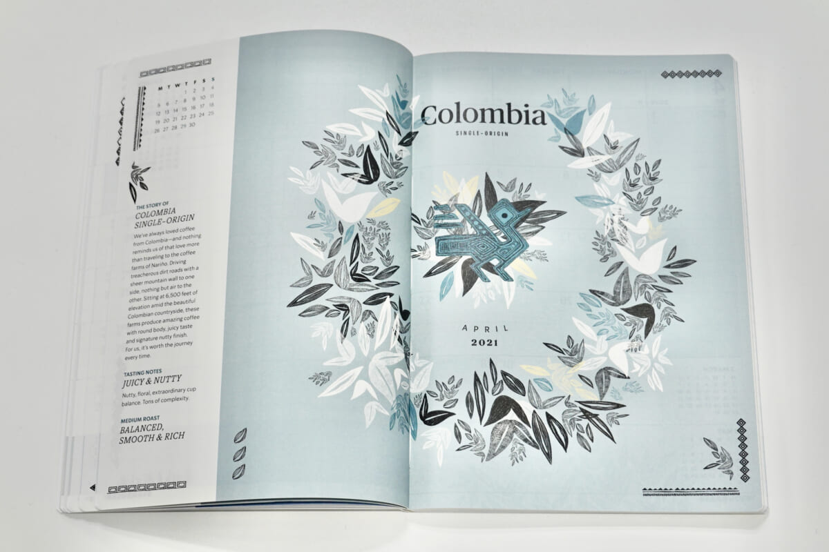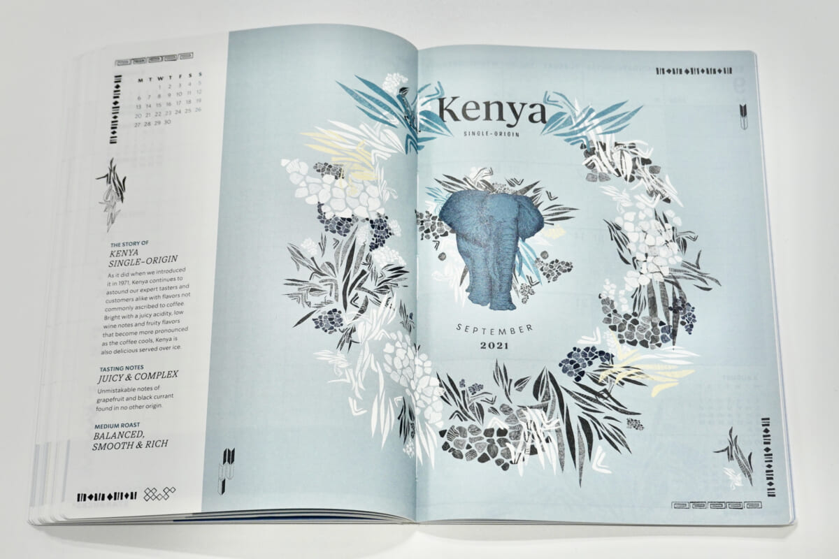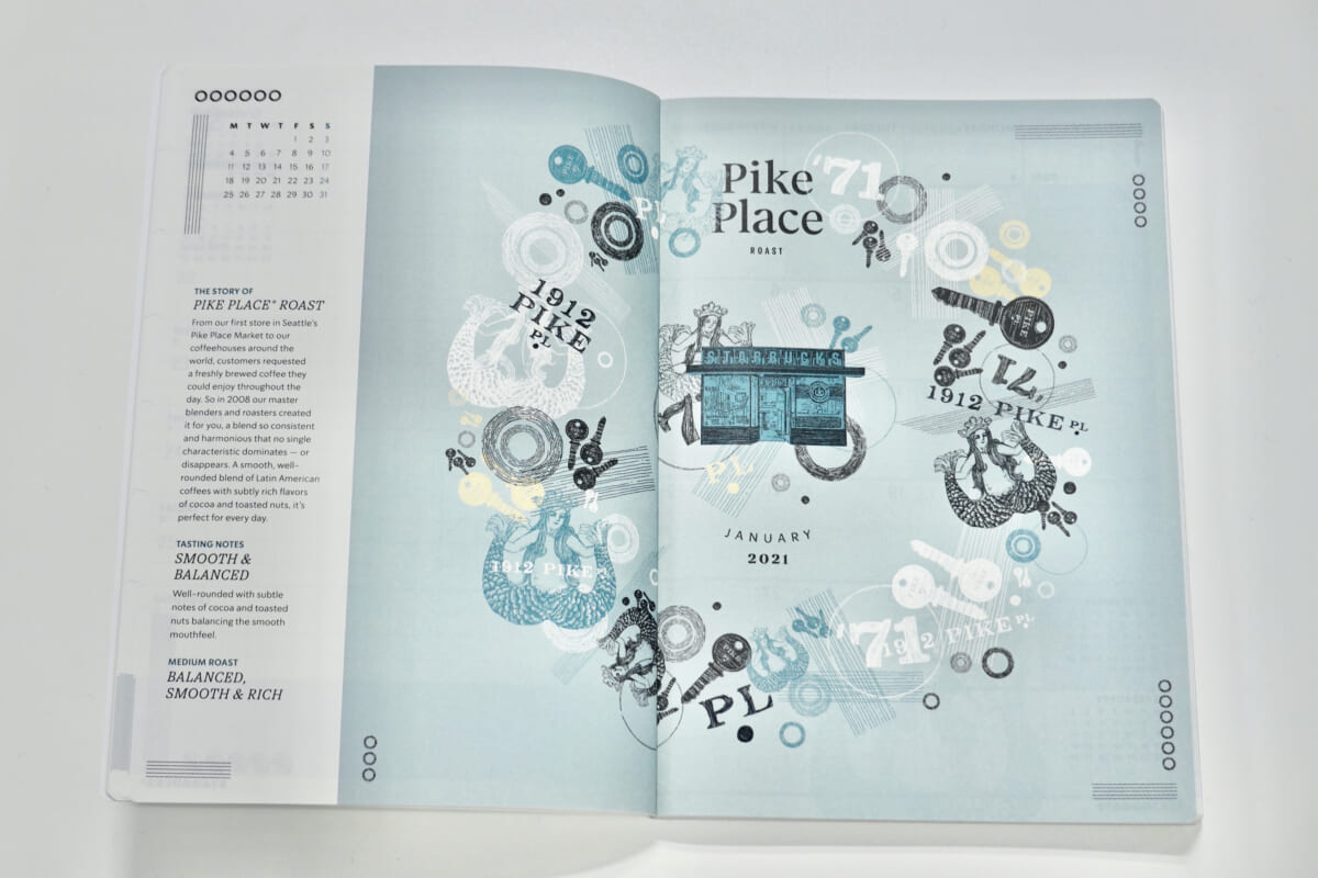 各月の扉には、スターバックスが製造・販売しているコーヒー豆のパッケージデザインをモチーフとしたイラストが描かれ、その脇にはコーヒーストーリー、キーワードと味わいの特徴が記されています。2020年12月から2021年12月まで、一つずつ見ていきましょう。