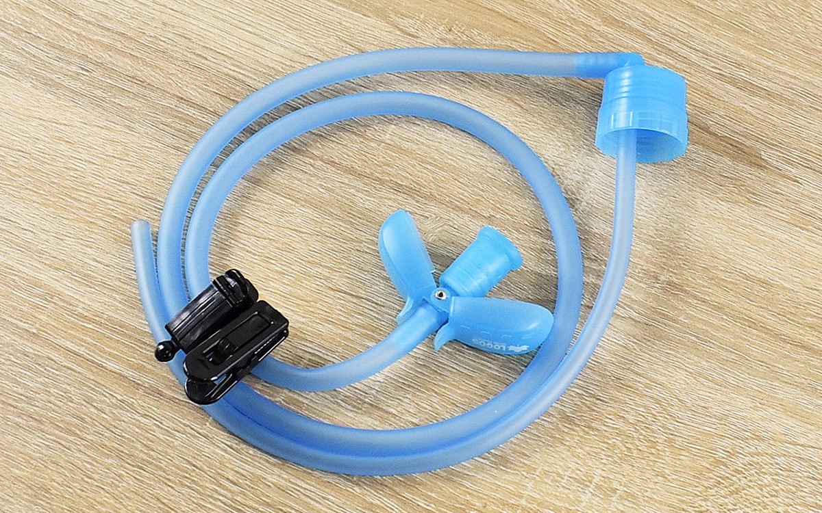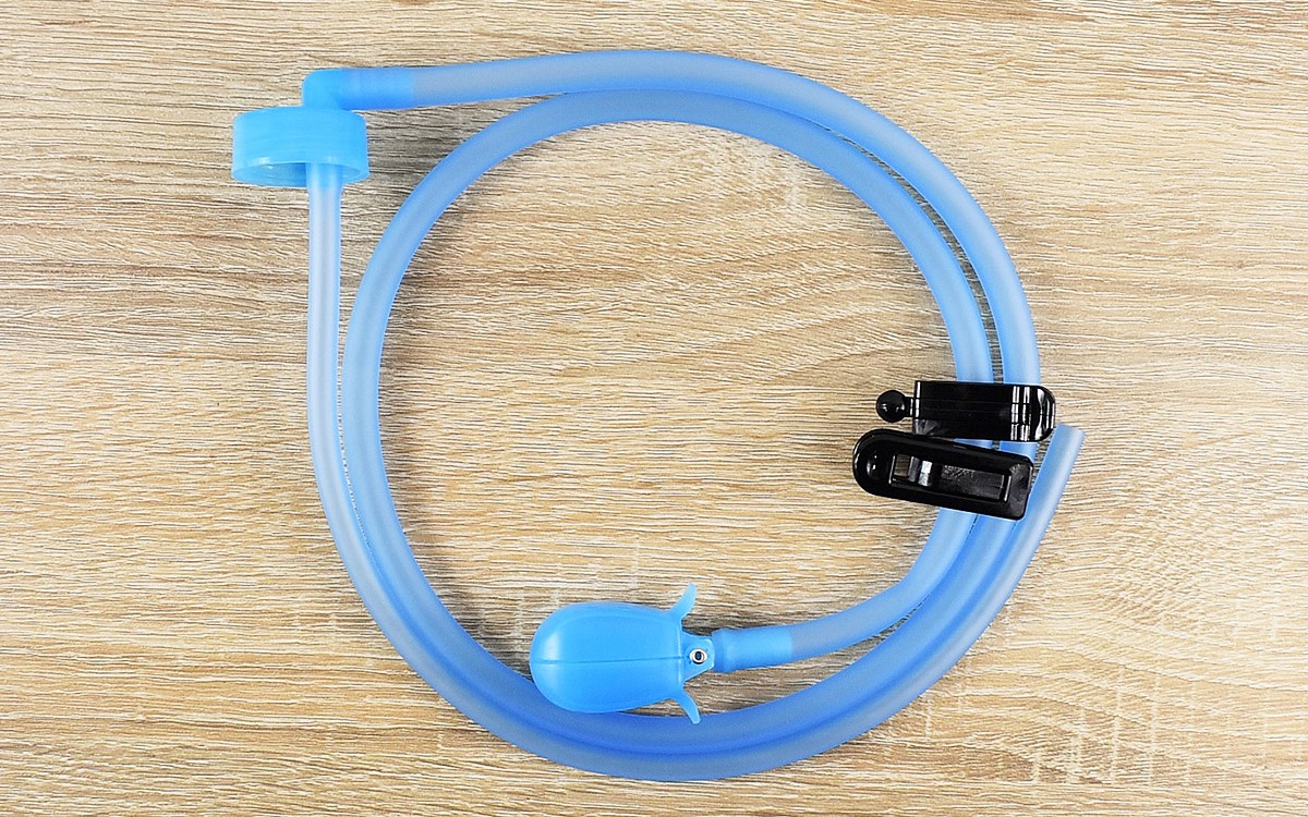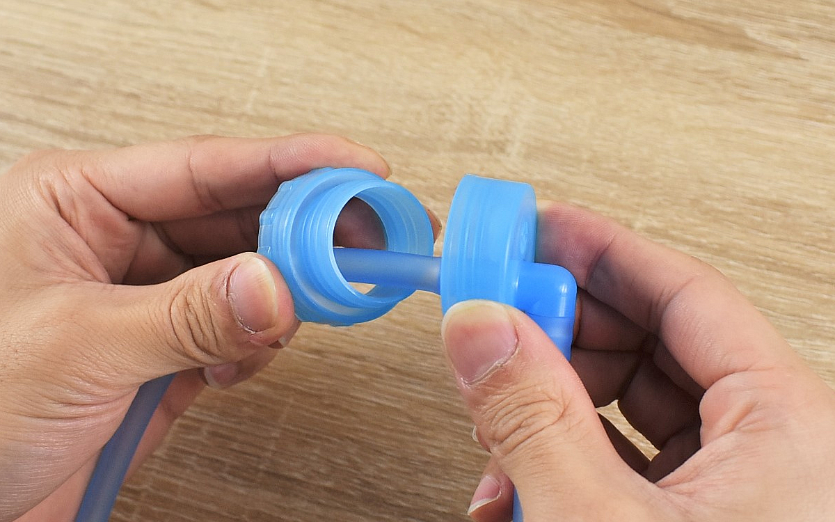 ブルーの長いチューブに、吸い口やボトルキャップなどがついている同商品。チューブにはボトルの中に入れるインナーチューブと外に出しておくアウターチューブがあるのですが、インナーチューブはあらかじめボトルの長さに合わせてカットしておきましょう。