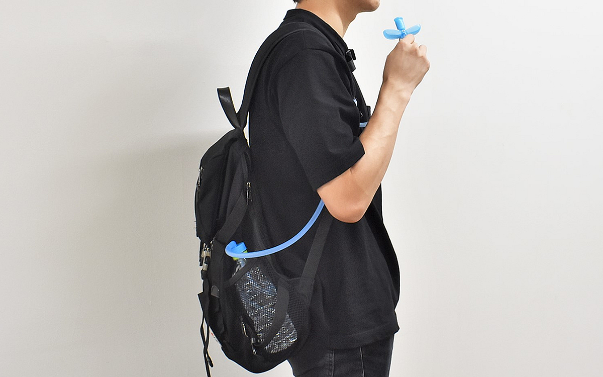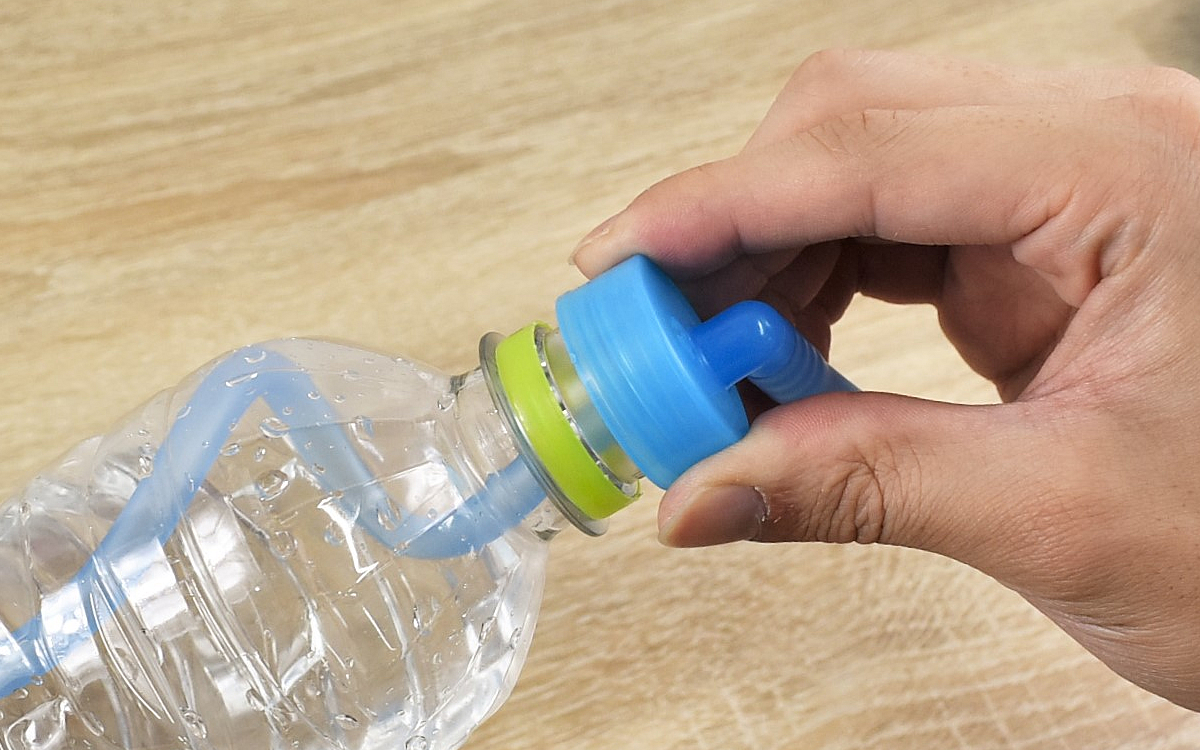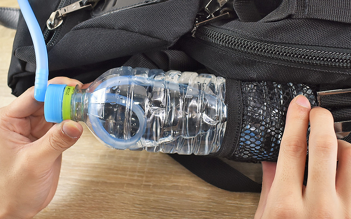 カットしたインナーチューブをペットボトルに差したら、ボトルの方を回してキャップをセット。ペットボトルはリュックのドリンクホルダーに入れ、キャップから出ているアウターチューブは取り出しやすい肩ベルトにセットすることに。
