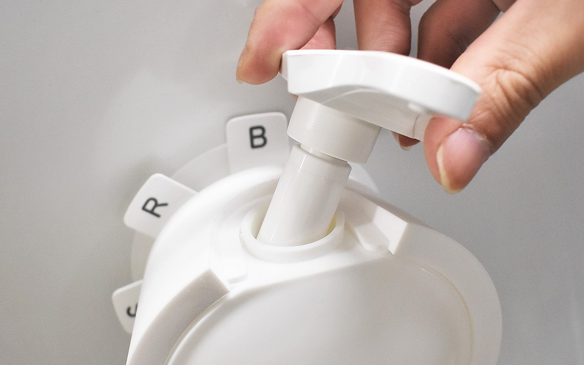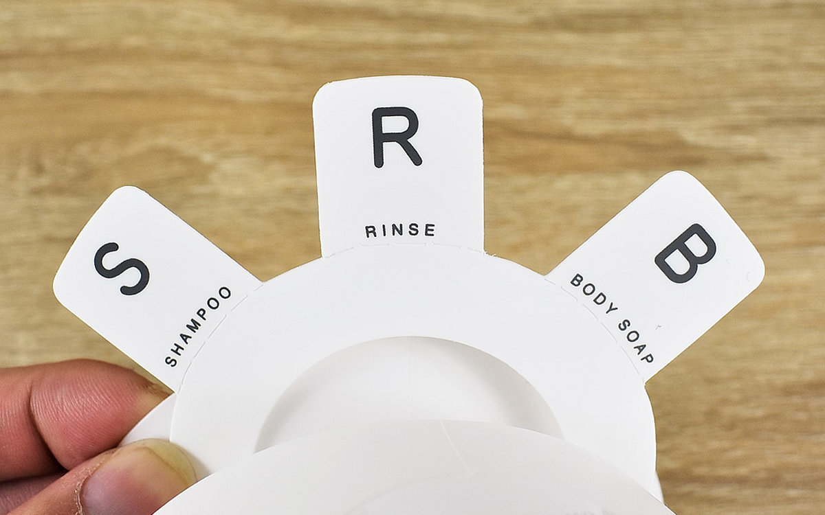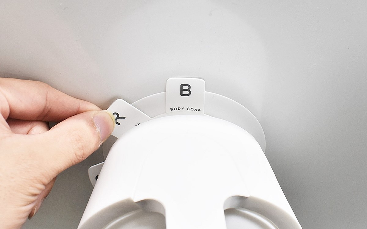 側面には「S」や「R」と書かれたタグが付属。シャンプーなら「S」といったように、中に入れたものと対応するタグをセットできます。ソープ間違いを防げるので、複数買いして中身ごとに使い分けるのもおススメですよ。