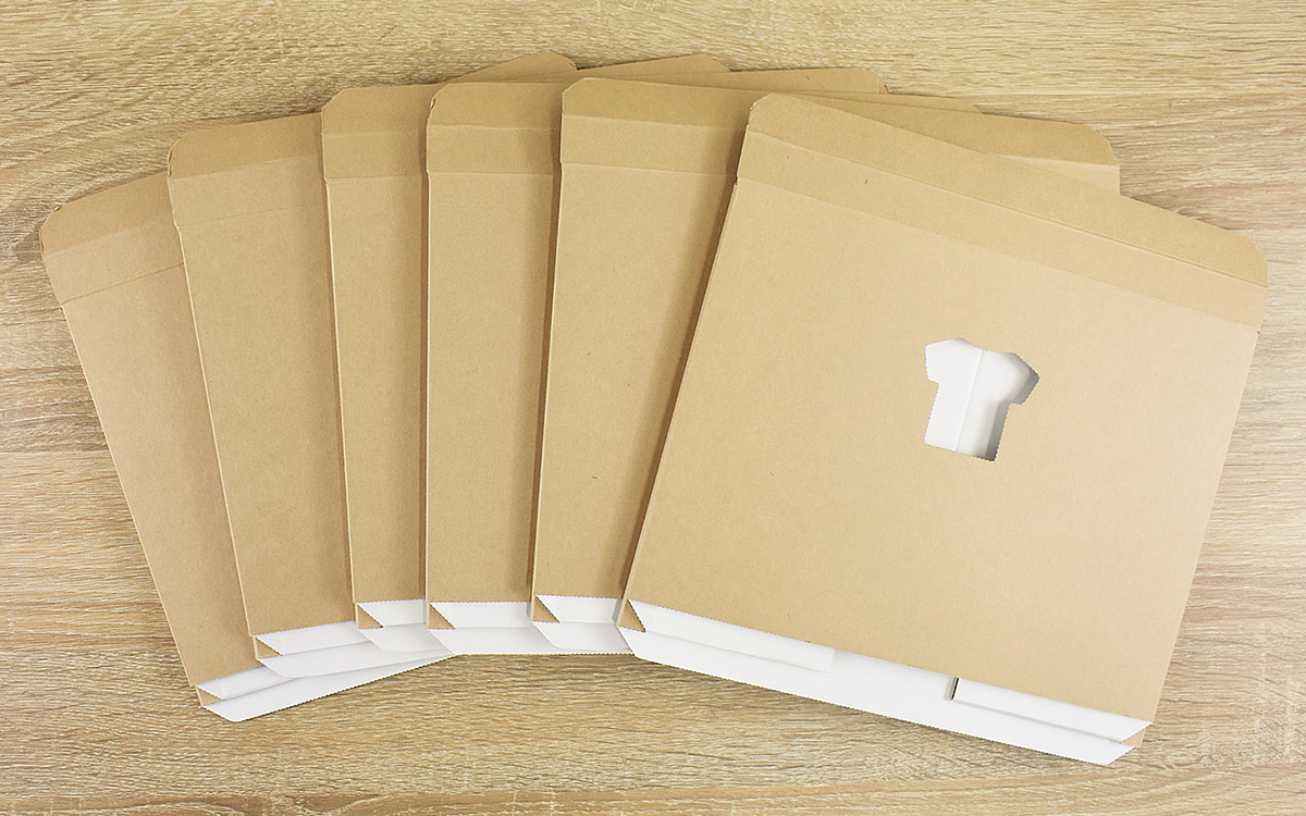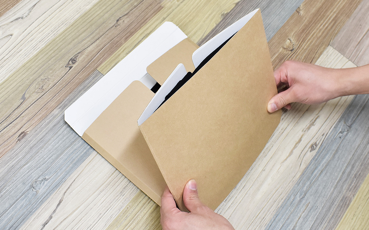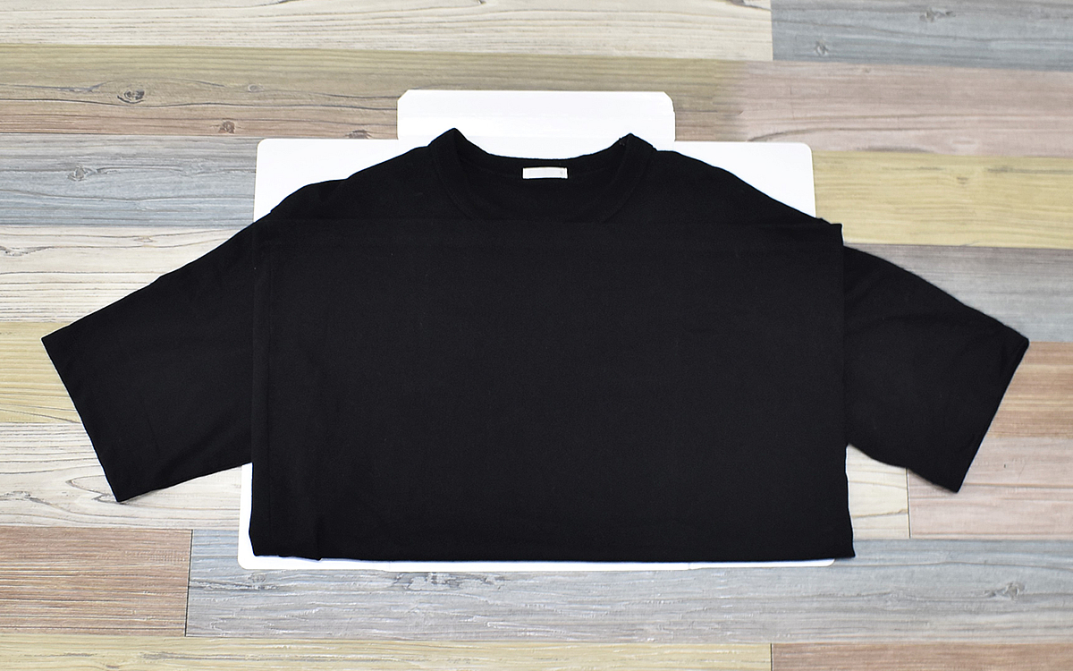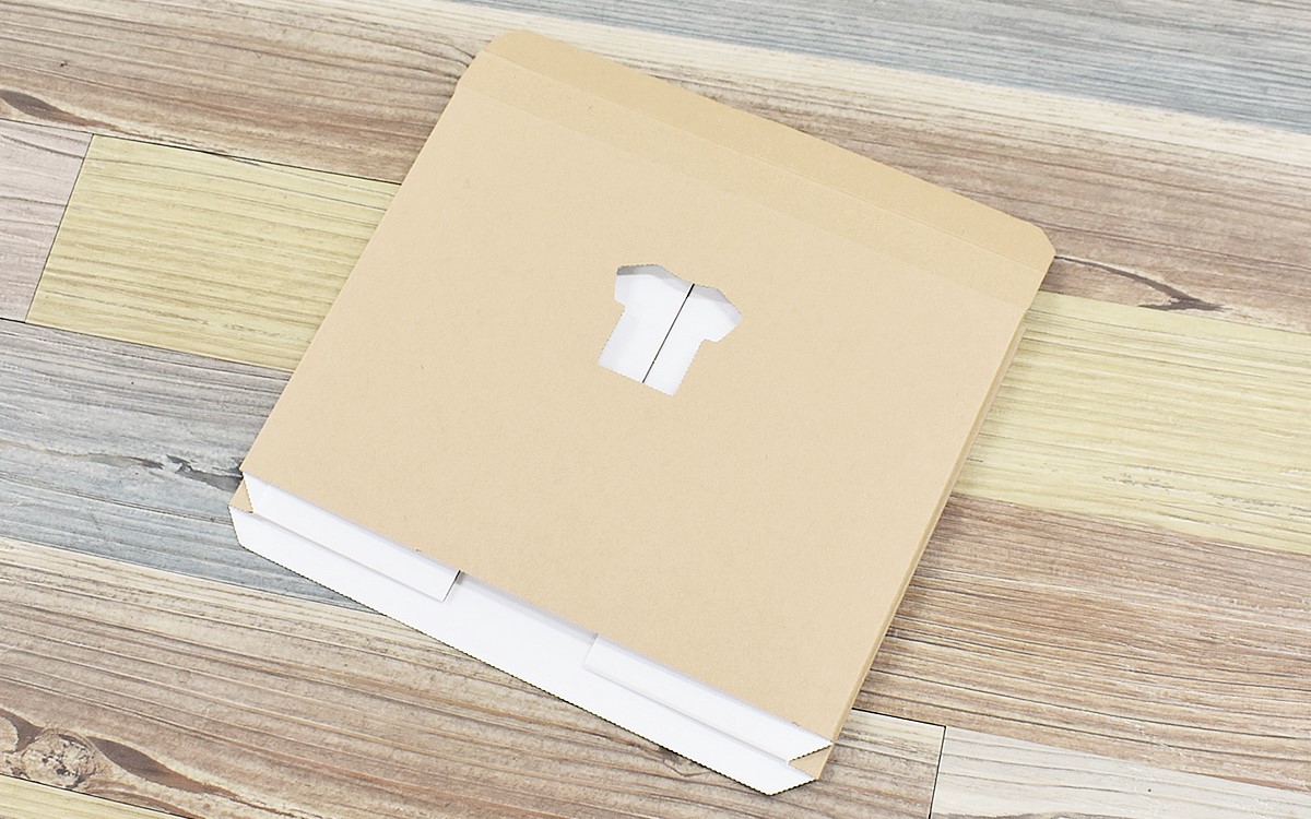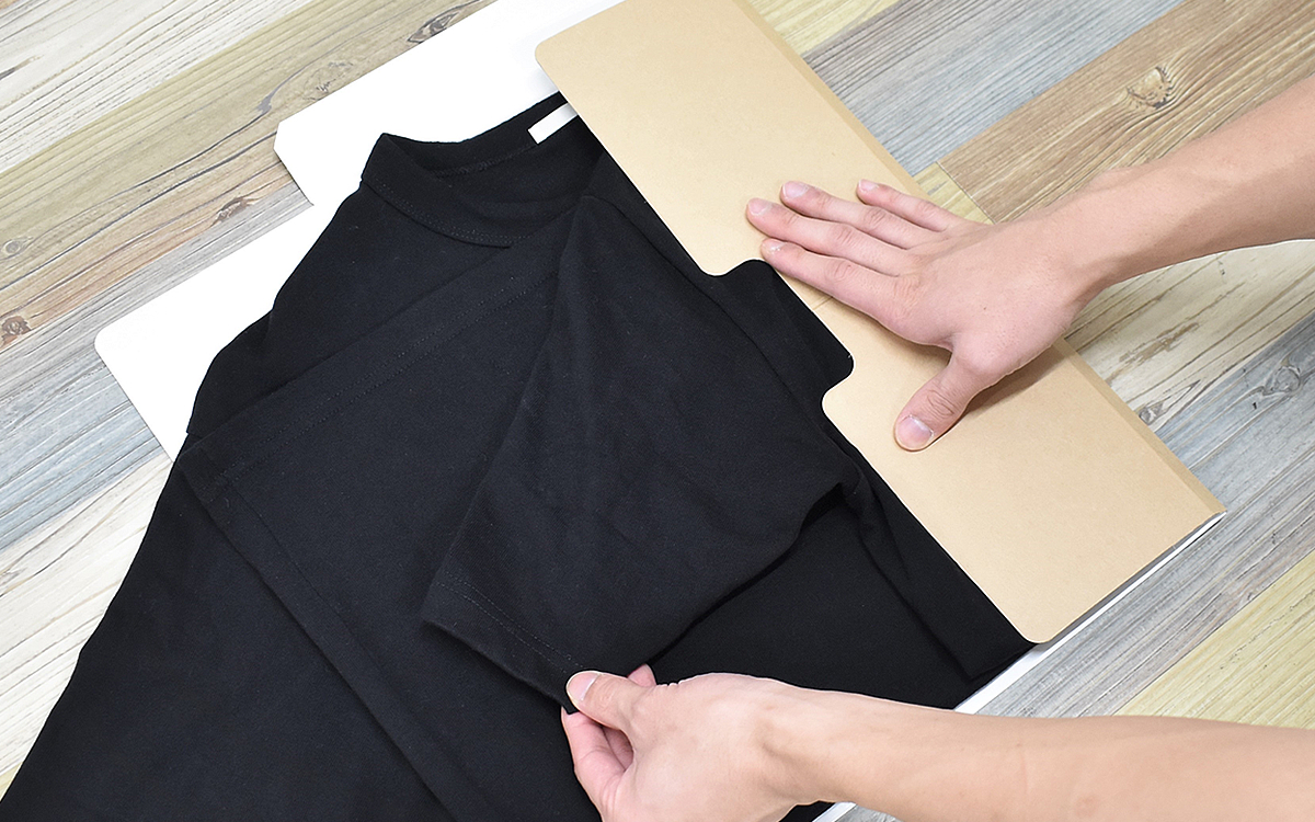 それでは、Tシャツを畳んでいきましょう。まず本体を開いて、半分に折ったTシャツをセット。後は段ボールの左右を内側に畳み、画像のように半分に折り曲げるだけです。