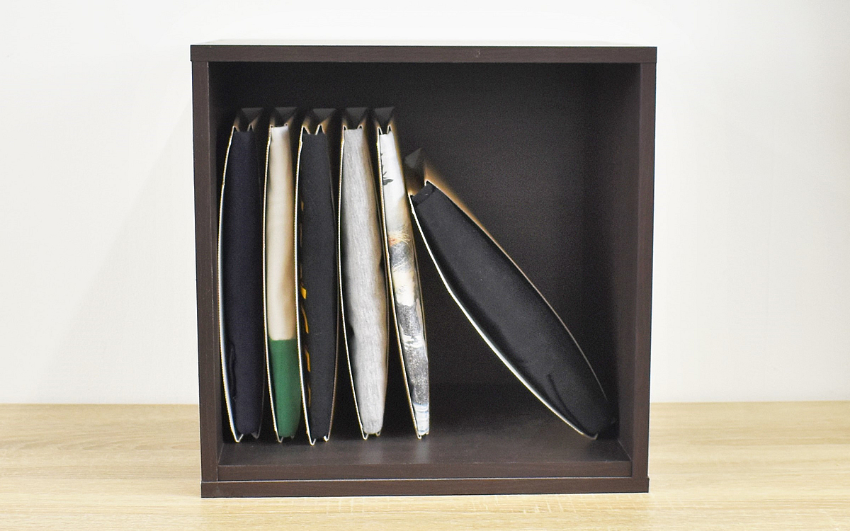 実際に折り畳んでみたところ、超コンパクトなサイズに畳めました。これならご覧の通り、本棚に立てかけることもできます。小さな段ボールの中に“すっぽり”と収まっているため、形が崩れないところも高ポイント。