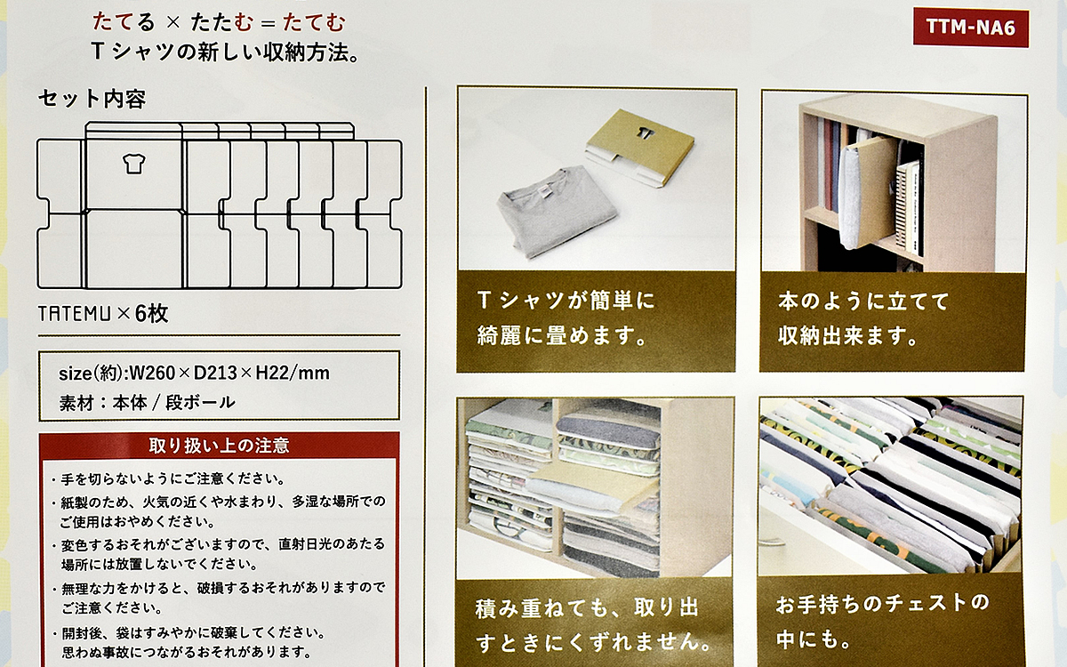 生活を豊かにする紙製の収納用品を販売する「バンドー」。同社の「TATEMU(たてむ)」は、Tシャツを簡単に畳める収納アイテムです。以前放送された「家事ヤロウ!!!」でも特集されており、ネット上では「散らかったTシャツをきれいに整理整頓できる!」「本棚にも洋服を収納できるところが優秀」といったコメントが続出中。絶賛されていた理由を確かめるべく、実際にレビューしていきます。
