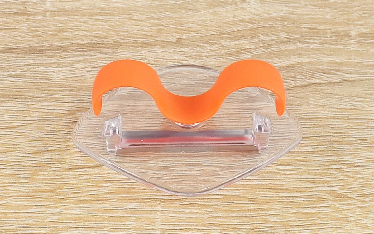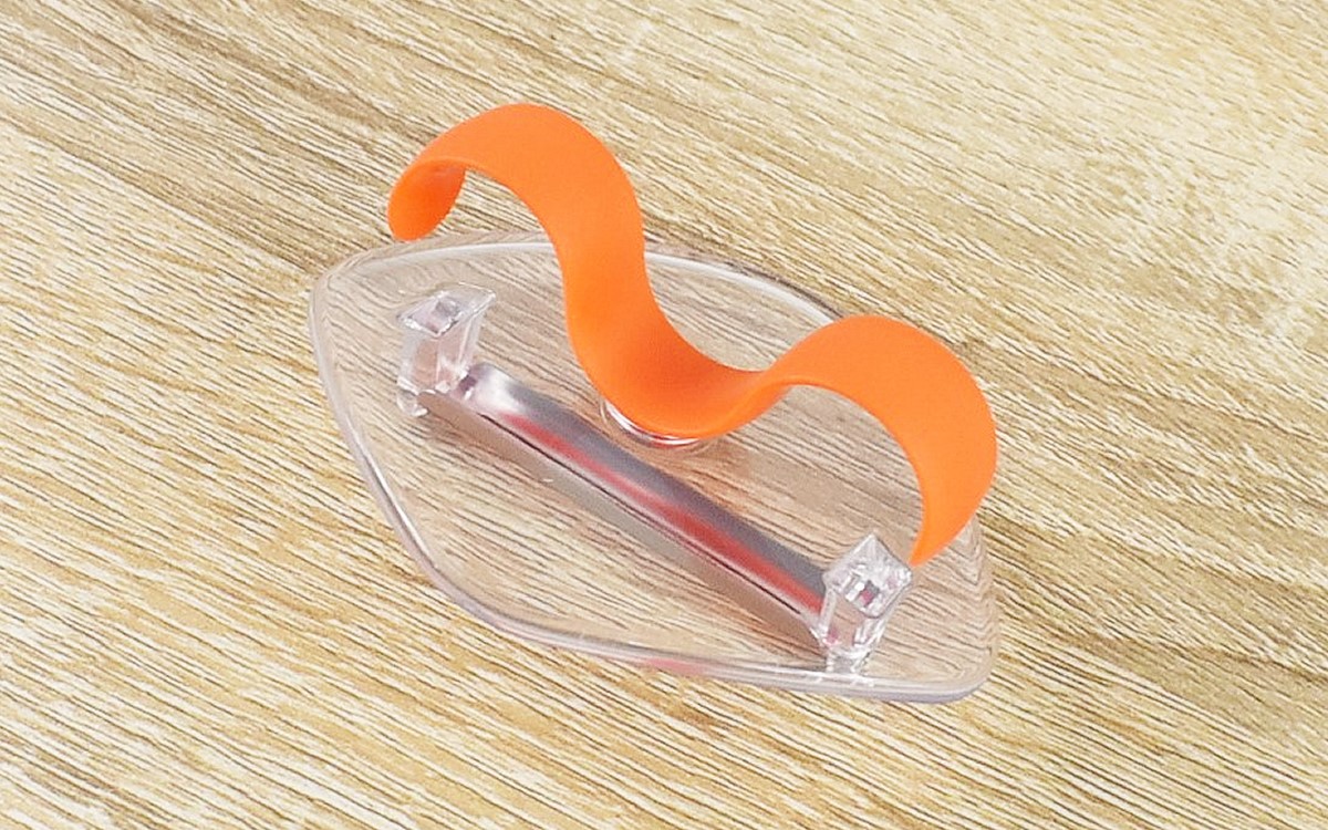 同商品は、透明なひし形のパーツに波状のフックがついた不思議なデザインのアイテム。65(長さ)×85(幅)×40mm(高さ)ほどの大きさで、透明パーツの裏に皮をむける刃物がついています。