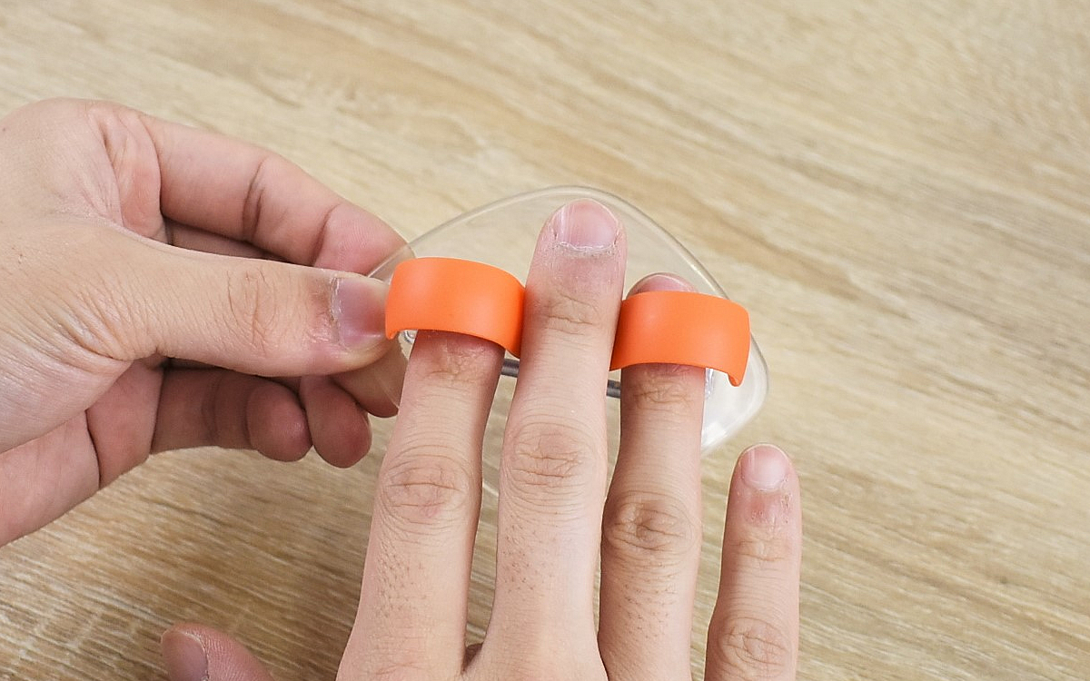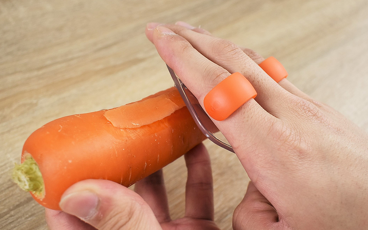 まずは人差し指と薬指をフックに差し込んで、持ちやすい状態にセット。フック部分は回転する仕組みになっており、手の大きさや食材に合わせて刃の角度を自由に調節することが可能です。