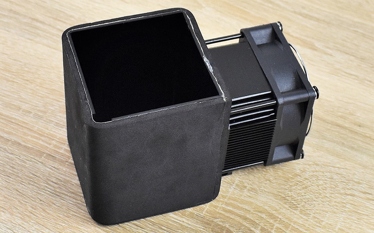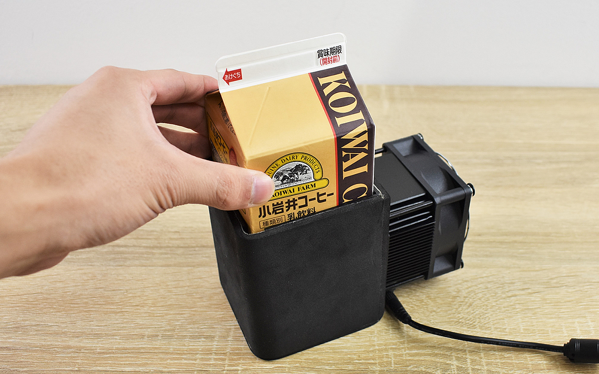パックを入れる四角いボックスに、冷却用のファンがついているシンプルなデザインの同商品。ボックスは500mlと1000mlの紙パック飲料に対応しています。ファンを含めた全体の大きさは、87(横幅)×150(奥行)×103mm(高さ)ほど。コンパクトで置き場に困らないサイズ感ですね。