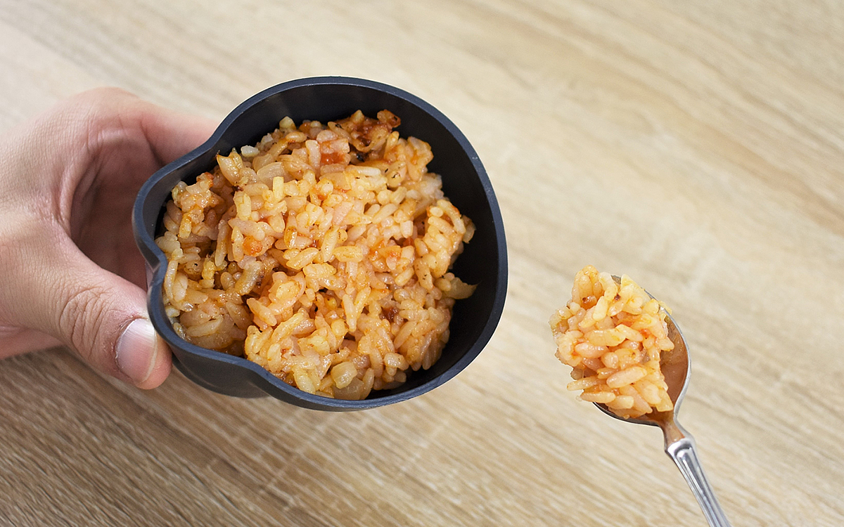 それでは、ケチャップライスを使用して検証開始。カップの中は口が広くなっているため、スプーンで簡単にご飯を詰めることができました。