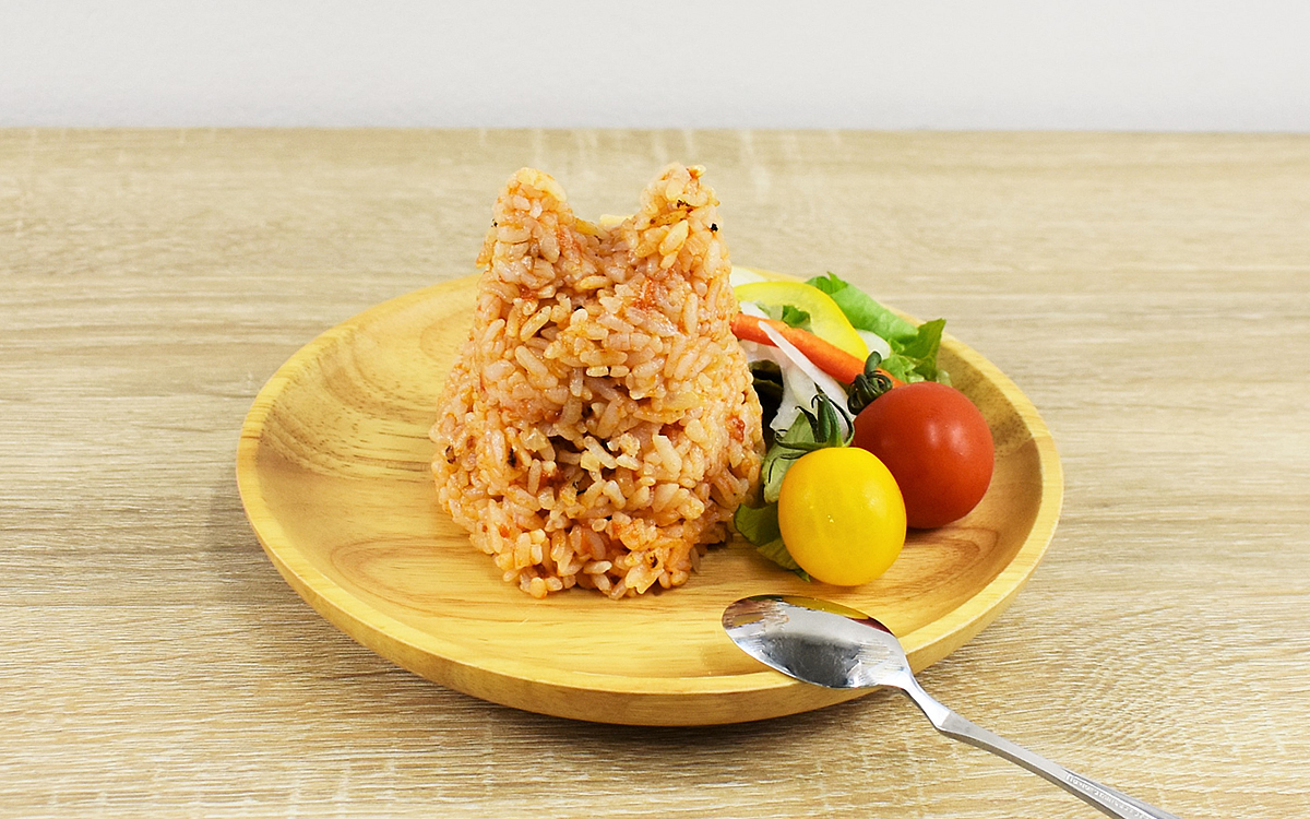 ご飯を入れて型を抜いてみたところ、可愛らしいネコのシルエットが登場。はじめは「耳の部分が崩れそう…」と不安でしたが、驚くほどきれいな仕上がりです。お皿にサラダやトマトを添えると、ご覧の通りカフェ風のプレートに早変わり。ちなみにご飯を詰める際は、崩れないようにギュッと押し込んでくださいね。