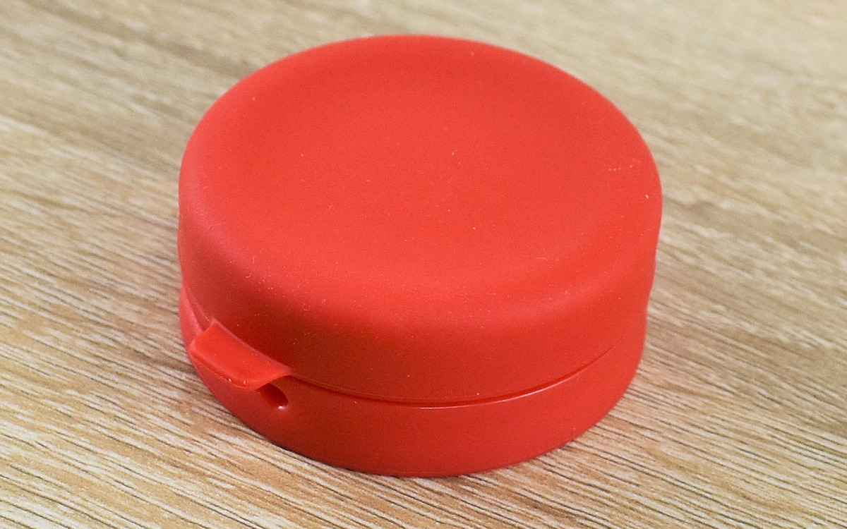 一見“朱肉”のような形をした同商品は、醤油やドレッシング、ケチャップといった様々な調味料が入るケース。大きさはおよそ53(幅)×21mm(高さ)ほどで、とってもコンパクトな見た目です。