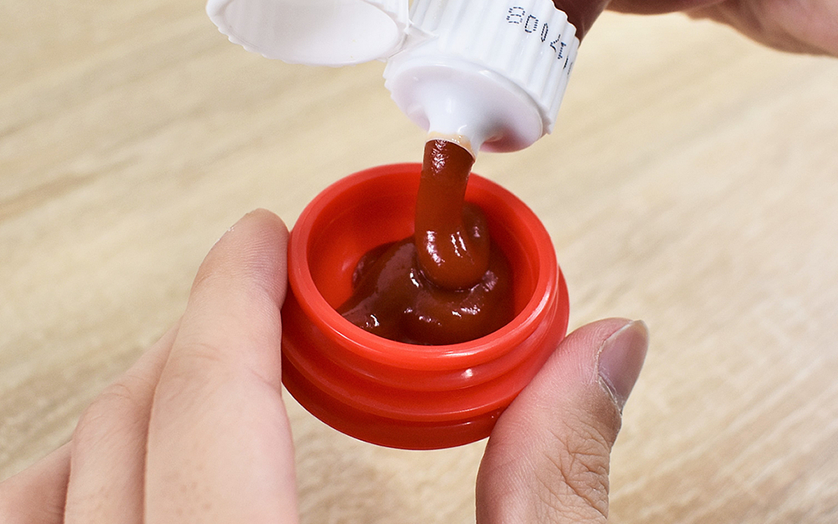 実際にケチャップを入れた画像がこちら。“密封”とまでは言えないものの、逆さまにしても液漏れする心配はありません。お弁当箱のバンドに本体のくぼみをセットすれば、ケースにしっかり固定されますよ。