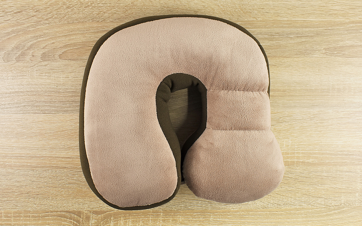 同商品は、31(高さ)×29(幅)×12cm(奥行)ほどのウレタン製クッション。真ん中に穴の開いたU字型の形状で、先端はボタンでつながっています。