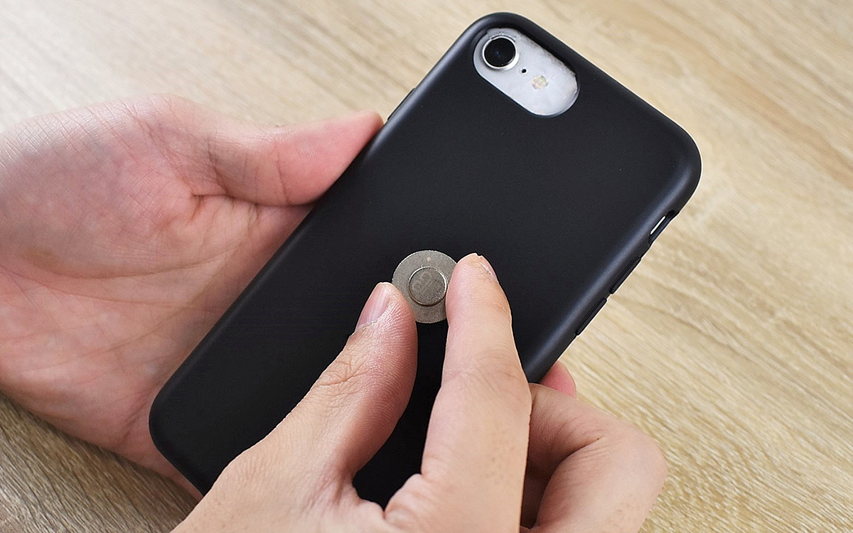 ホルダーの中央にはマグネットがついており、付属のボタンを好きなところに貼りつけることで簡単にホルダーをセットできるという仕組み。さっそく今使っているスマホカバーの中央にボタンを装着してみましょう。