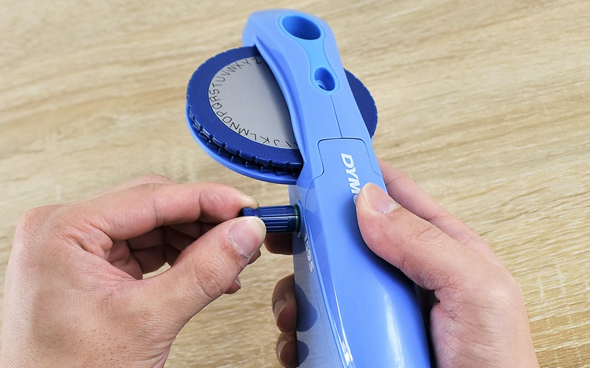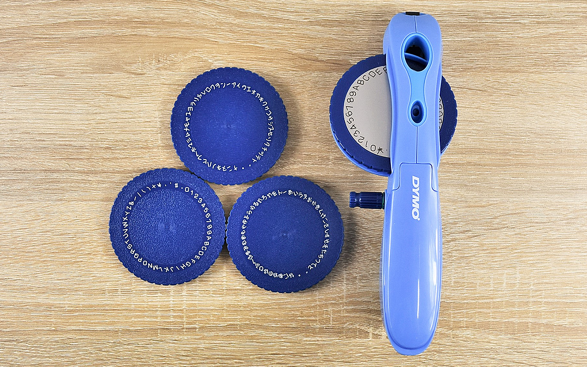 まずは本体にテープをセットし、印字したい文字の円盤を装着。円盤を回して文字を選び、ハンドルを握るとテープに文字が打ち込まれます。