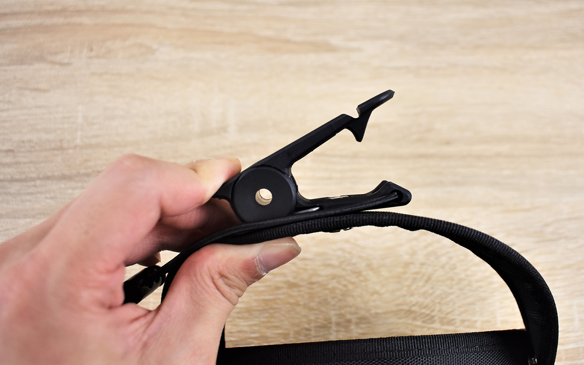 このモデル最大の特徴となるのが、取っ手の中央にあるクリップ。先端に突起がついた特殊な形状で、ズボンのベルトループやリュックの肩紐などをしっかり挟み込むことができました。クリップ自体も、洗濯ばさみのようにワンタッチで着脱できる親切なデザイン。持ち方を変えたい時もスムーズに移動が可能です。