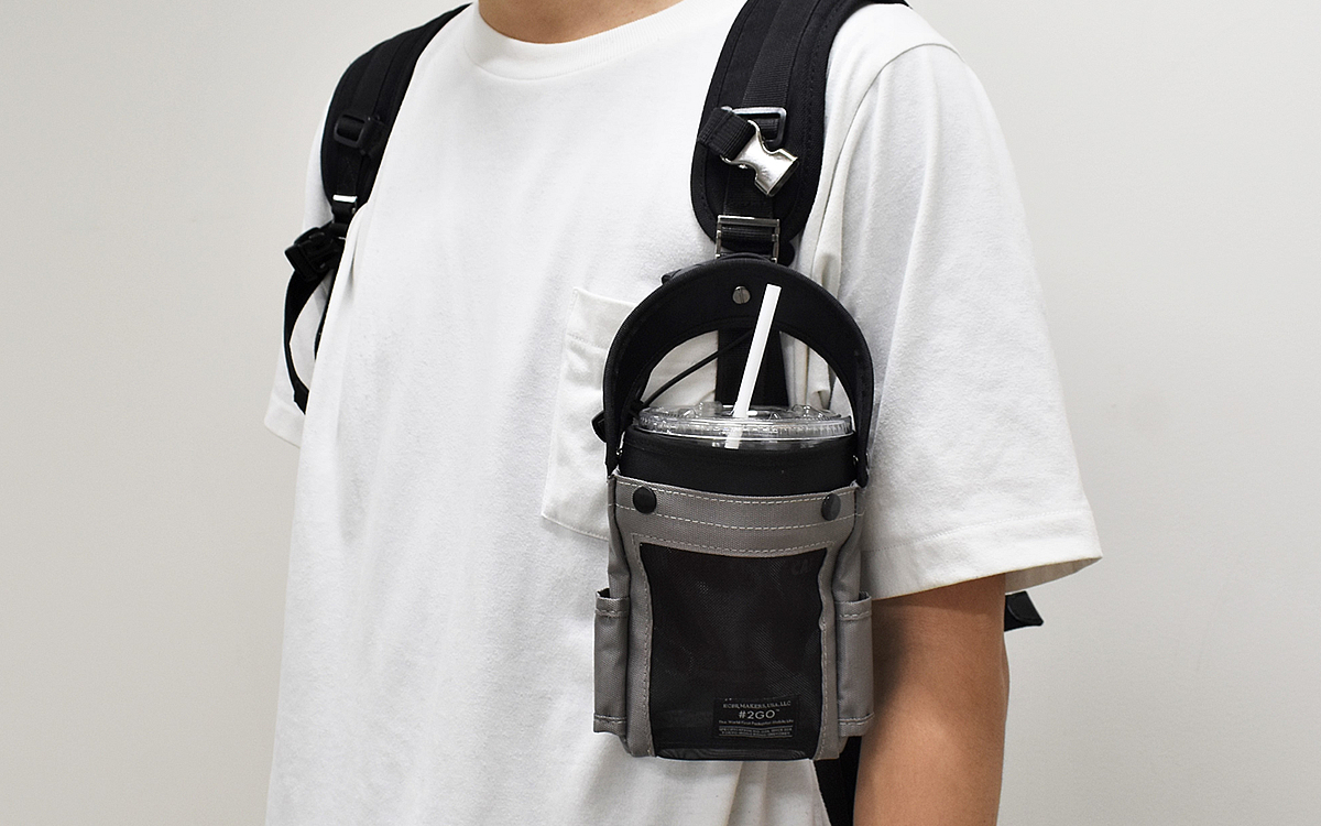 コンビニやカフェのテイクアウト用コーヒーは、フタつきのカップに入っていることがほとんど。私もしょっちゅう飲むのですが、スマホとカップを持つだけで両手がふさがり不便に感じる場面も多くあります。そんな悩みを解消するために購入したのが、「#2GO(トゥーゴー)2019年進化版モデル」(2980円/税別)。カップがすっぽり収まるサイズのモバイルマルチポーチです。