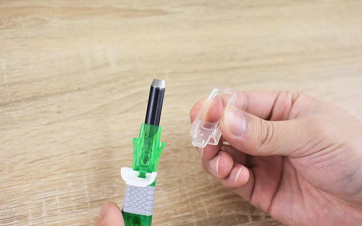 5本中3本の彫刻刀には、外さなくても彫刻ができるU字型の安全カバーが付属。理想的な角度で彫刻できるよう計算された角度が特徴的です。