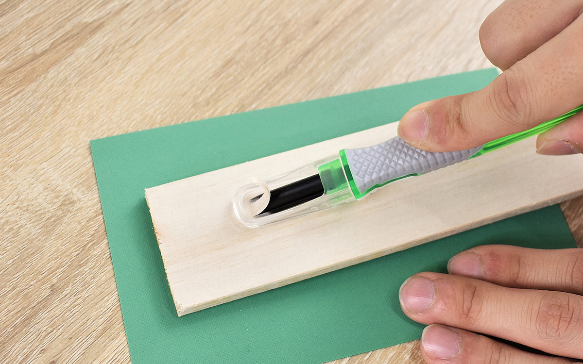 気になる切れ味を確かめるため、用意した木材をカバーつきの彫刻刀で掘ってみることに。付属のノンスリップシートを下に敷けば、より安全に掘ることができますよ。刃先に使用されている「スーパー全鋼刃」は、折れたり曲がったりしにくい丈夫な金属。切れ味も鋭く、軽い力でスムーズに木材を削れました。
