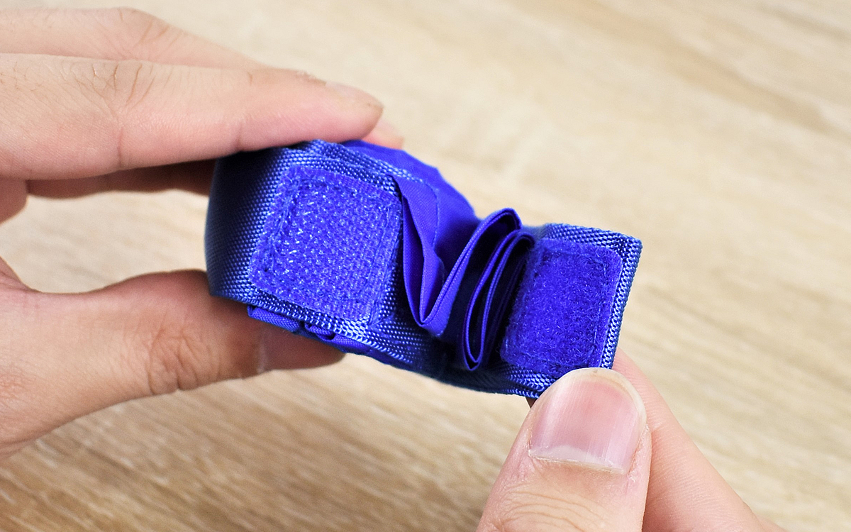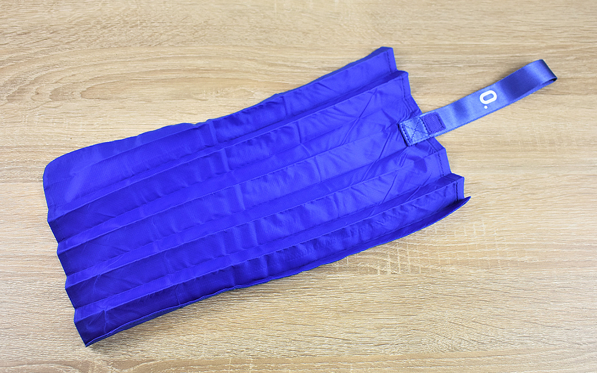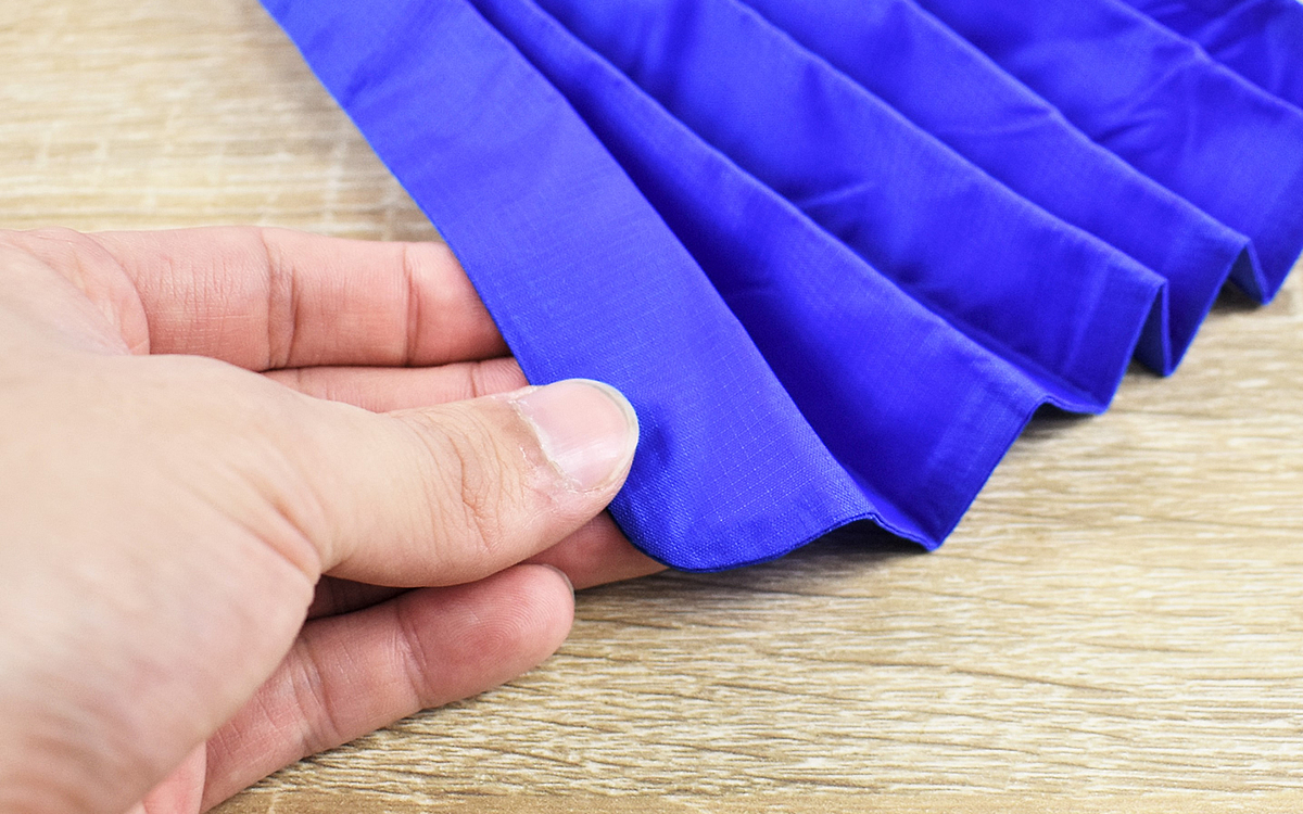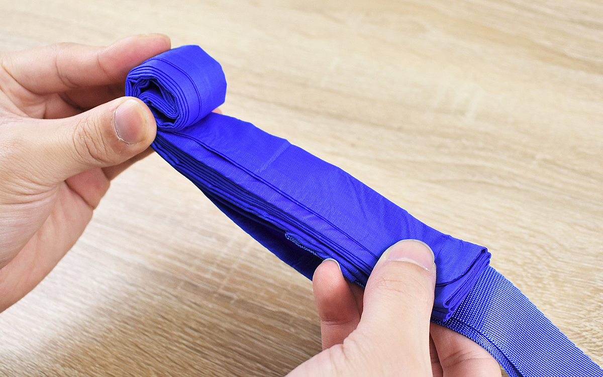 生地には形状記憶加工が施されていて、使い込んでも洗濯しても簡単に折りたたむことが可能。折り目に合わせて細くたたみ、端からくるくる巻きつけるだけで元の小さな状態に戻りました。