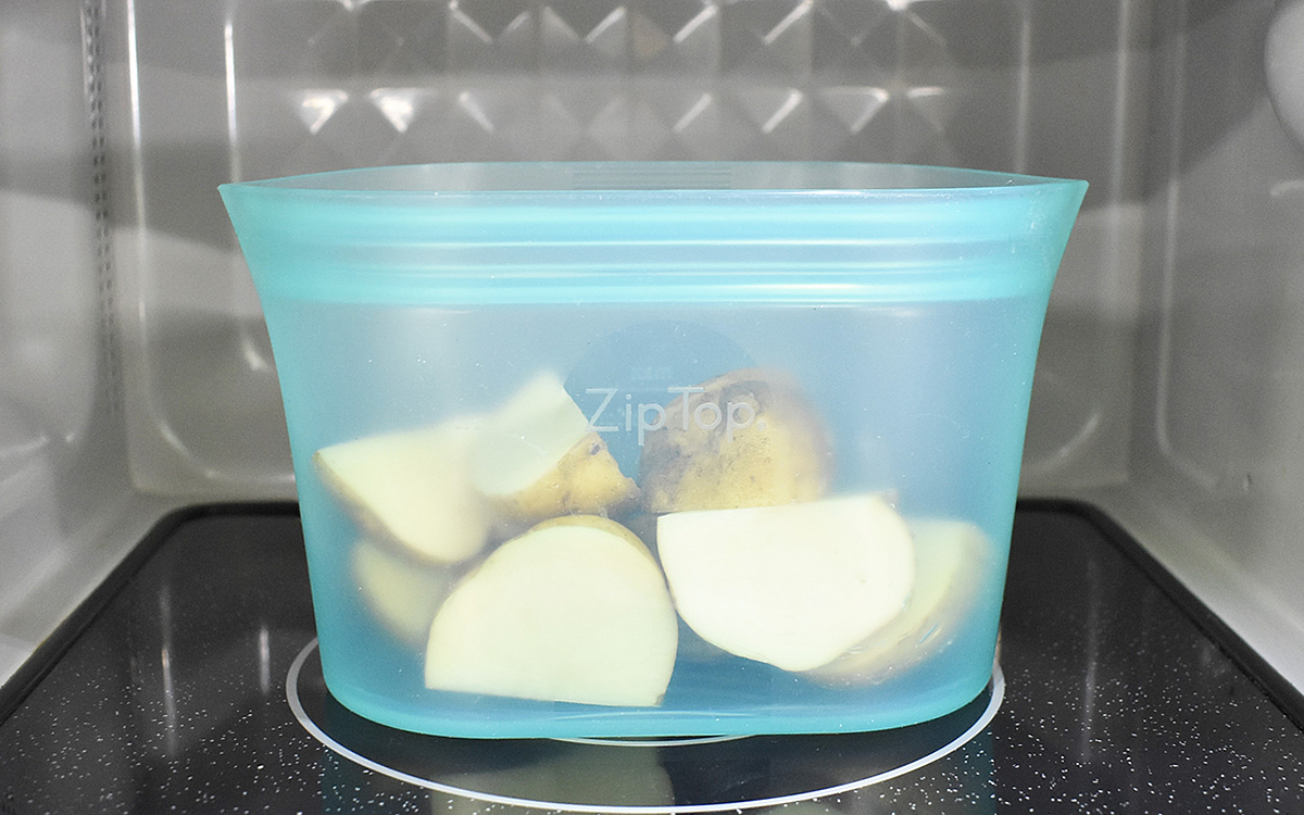 半透明で中に入れた食材がひと目でわかる点も便利。電子レンジに入れても問題なく使えるため、冷蔵庫から出したらそのまま調理に使えますよ。試しにジャガイモを数分温めてみたところ、ほくほくの柔らかい状態になりました。