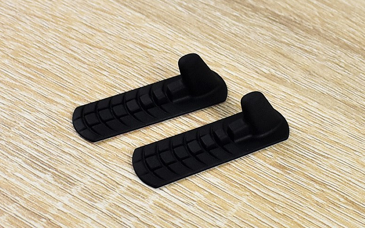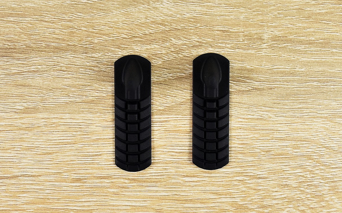 シリコンゴム製の小さな突起が2つセットになっている同商品。大きさは45(長さ)×14(幅)×14mm(高さ)ほどで、平らな面には滑り止めの凸凹がついています。