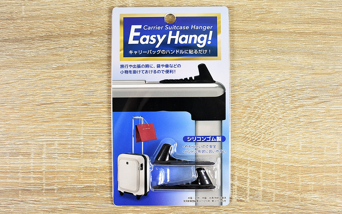 長期の旅行や出張の際には、たくさん荷物が詰められるキャリーバッグが頼もしい相棒に。しかしキャリーバッグに加えて貴重品を入れたバッグやお土産などを持つと、すぐに両手がふさがってしまいます。そんな時に便利なのが、キャリーバッグに貼りつけて使う「EasyHang!」(メーカー希望小売価格:730円)。ハンドルを荷物掛けとして使えるようになるアイデア商品です。