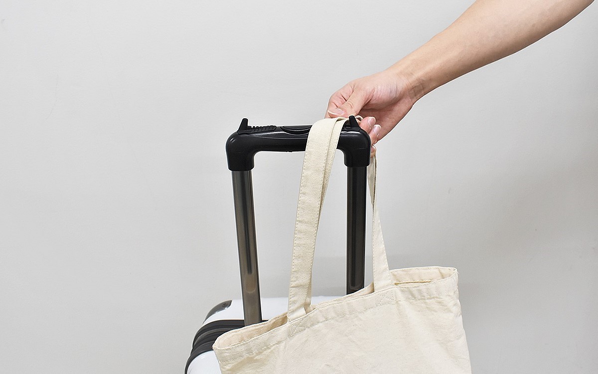まずは裏側の粘着テープをはがし、キャリーバッグのハンドルに設置。横幅が狭いため、細いハンドルにも違和感なくフィットしました。ハンドルの形状によっては、シリコンゴムを曲げて使うことも可能。これなら幅広い形状のキャリーバッグに使えますね。