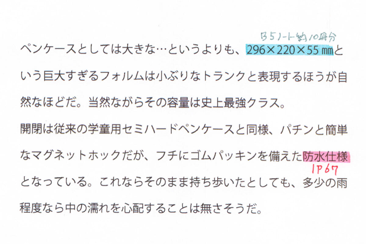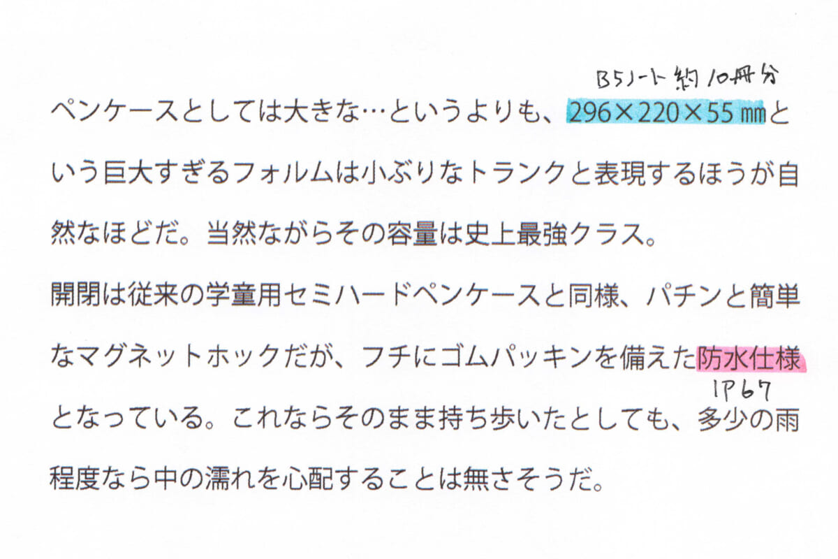 例えば、下の写真のような状況で、ラインを引いた部分に対して「さらに強調して伝えたい情報」と「そこまで目立たなくていいけど見ては欲しい補足」を追記したいとしよう。それぞれを黒のボールペンで書いて、果たして満足のいく結果が得られるだろうかというと、それは難しい。なにしろ、ライン引いたところだけに目が走ってしまうから。