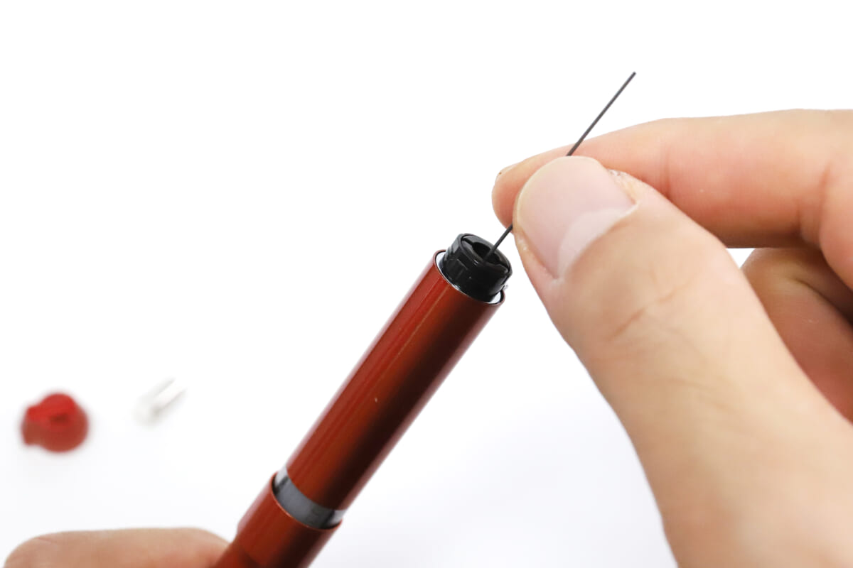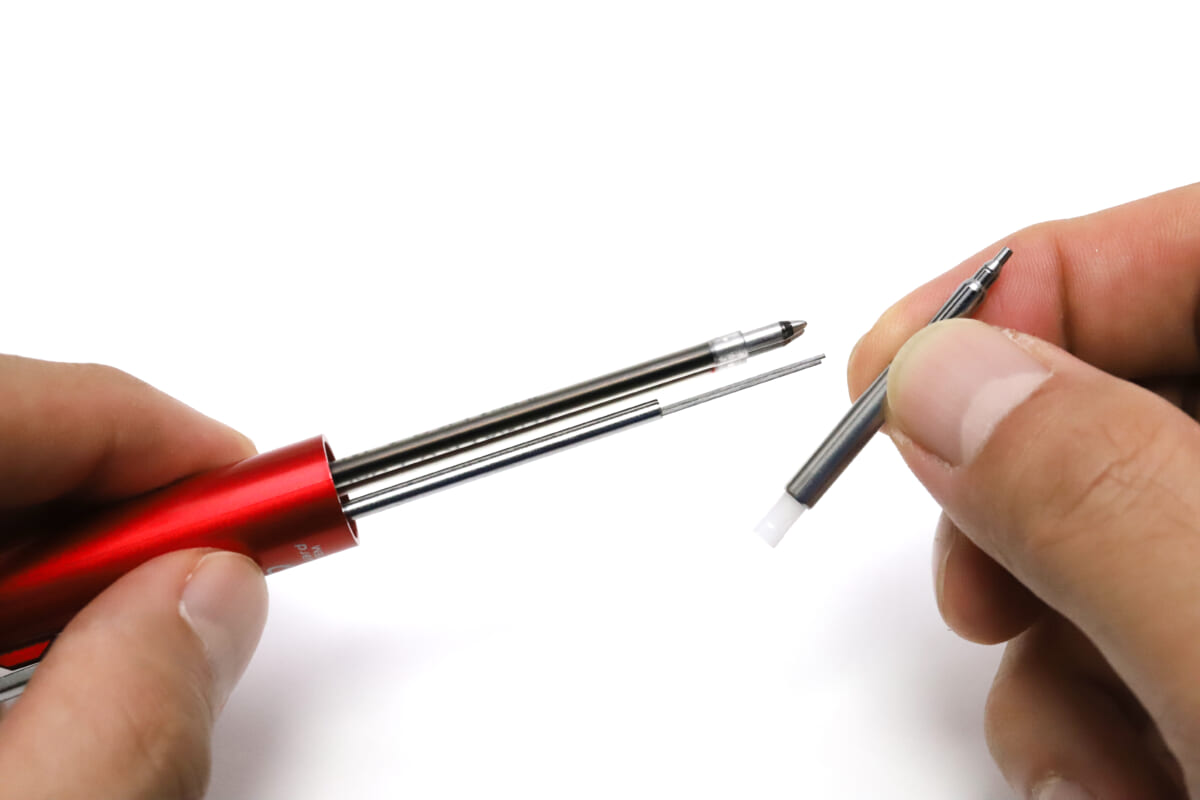 芯を軸後端から入れるって、そんなのシャープペンシルなら普通では? と思った人は、おそらく多機能ペンを使ったことがないか、使い慣れていないのだろう。多機能ペンでのトップインは、普通に考えれば不可能なのだ。