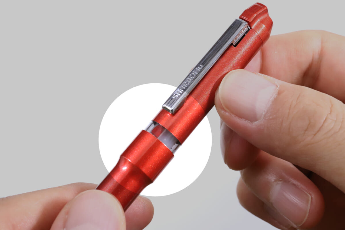 ここまでは、まずなんの変哲もない製品としか思えないし、見た目も、後軸がやや太くなっているかな? 程度の印象。驚くべきは、シャープ芯が軸後端から入れられる独自の“トップインシャープ機構”を持っている、ということなのだ。