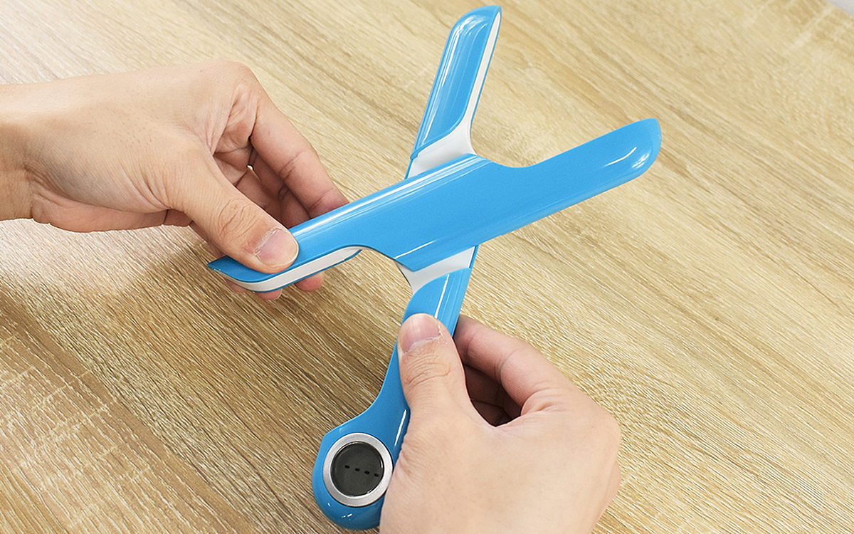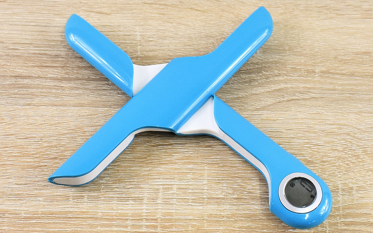 使用するときは十字型に開き、丸い液晶画面の横にあるスイッチをオンに。計りたいものを十字の中央部分に乗せれば、自動で計量が始まります。