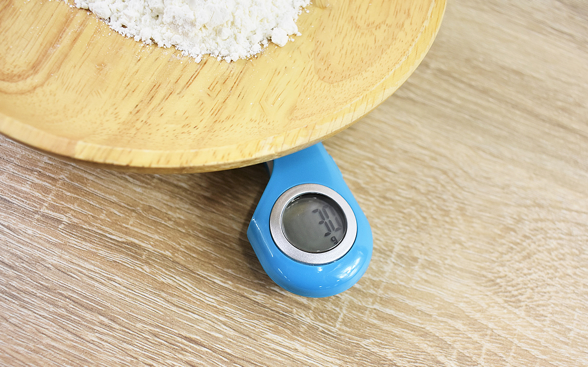 同商品は、21.2(長さ)×3.6(幅)×1.5cm(厚さ)ほどの折りたたみ式クッキングスケール。細長くて丸みを帯びたフォルムで、調理器具には見えないデザインがおしゃれです。