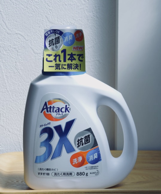 このアタック3Xでは、「抗菌」「洗浄」「消臭」の3つのキーワードで、衣類の汚れをしっかり落としつつ、部屋干しのイヤなニオイも防ぐことをアピール。さらに、洗濯槽のカビの発生まで抑えるとしています。