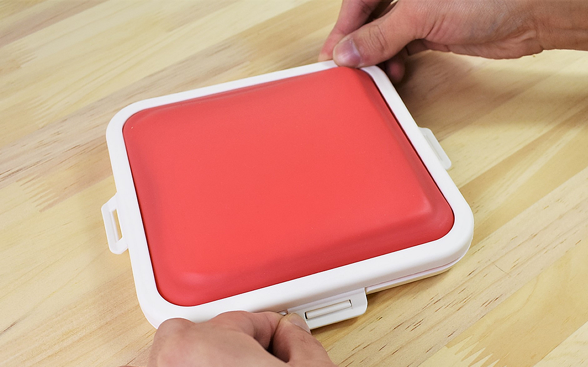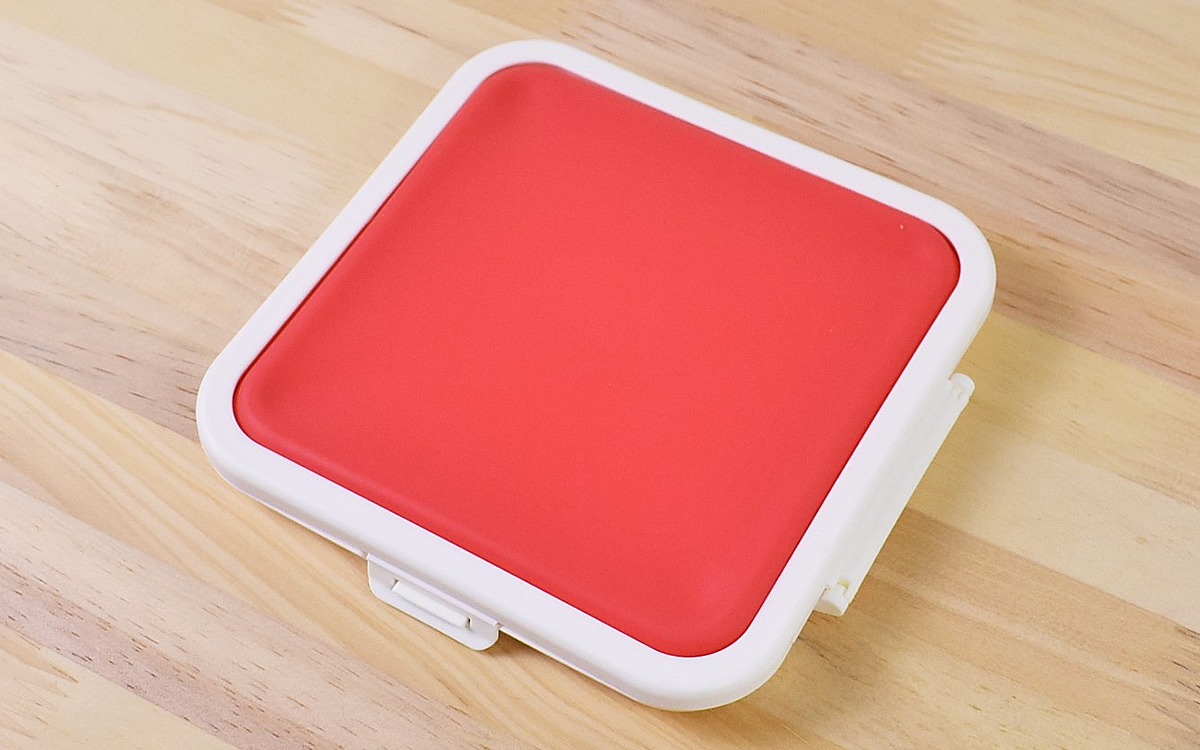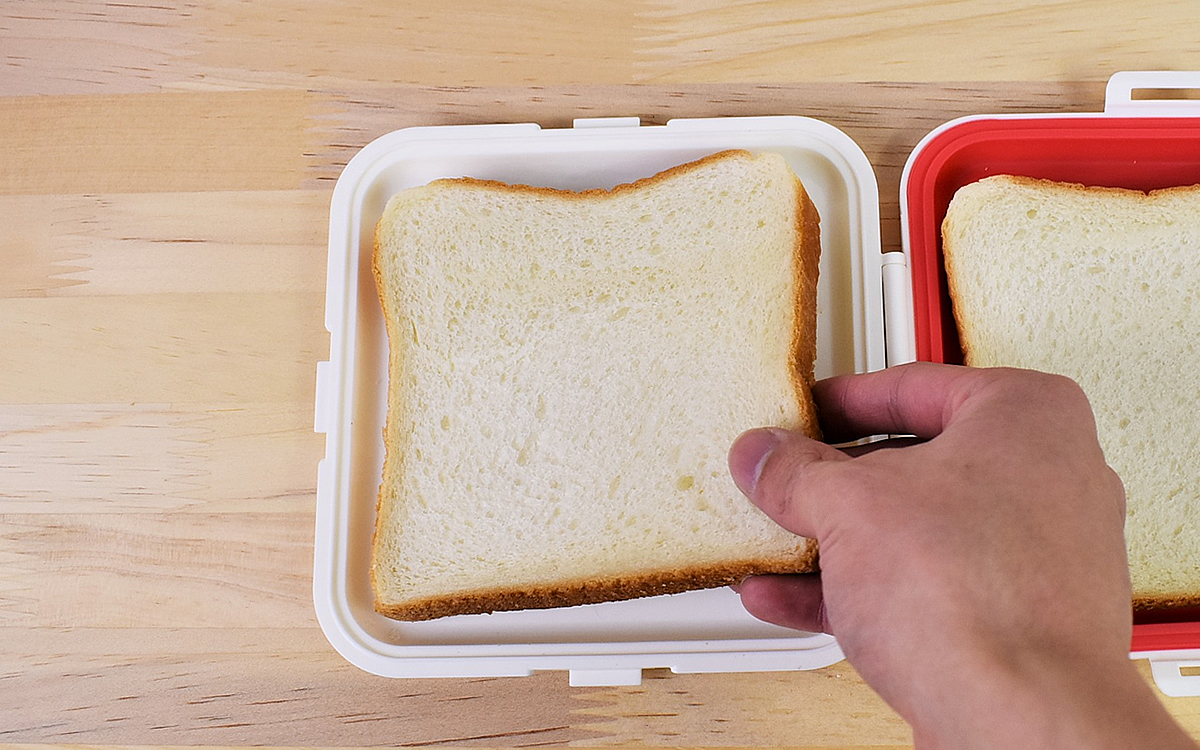 優しい風合いの赤いカラーが特徴的な同商品。約162(縦)×22(厚み)×165mm(横)ほどの大きさで、3辺の留め具を外すと本のように大きく開きます。中にパンや具材を置いて閉じるだけで、簡単にサンドイッチが作れるという仕組み。さっそく食パンを用意して、実践してみましょう。