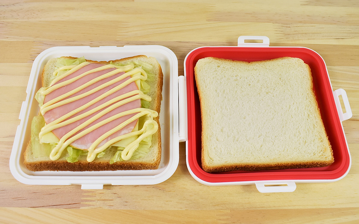 具材を詰めすぎてちゃんと閉じられないのでは? と少し不安になったのですが、赤い部分がシリコーンゴム製なのでパンの形にぴったりフィット。密封性も高く、そのままバッグに入れてもレタスの水気やマヨネーズがはみ出すことはありません。