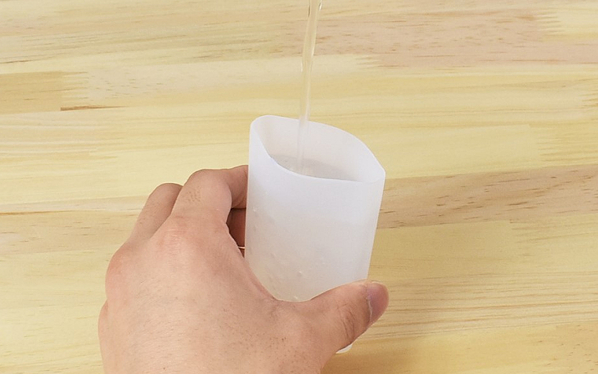 試しにテーブルの上へ置いてみると、思ったよりしっかりと自立。水を注いだ状態だとさらに安定感が増し、普通のコップと同じように使えますよ。ただし軽い衝撃でも簡単に倒れてしまうため、置きっぱなしにする時は注意してください。