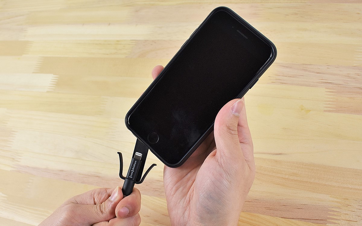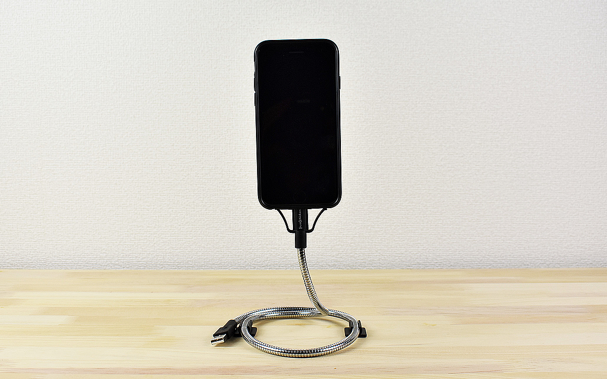 商品の両端は、USB端子とiPhone用ライトニング端子。ライトニング端子側にはiPhoneの背面と底面を支えるパーツもついているので、実際に接続してみてもしっかり固定されて安定感があります。