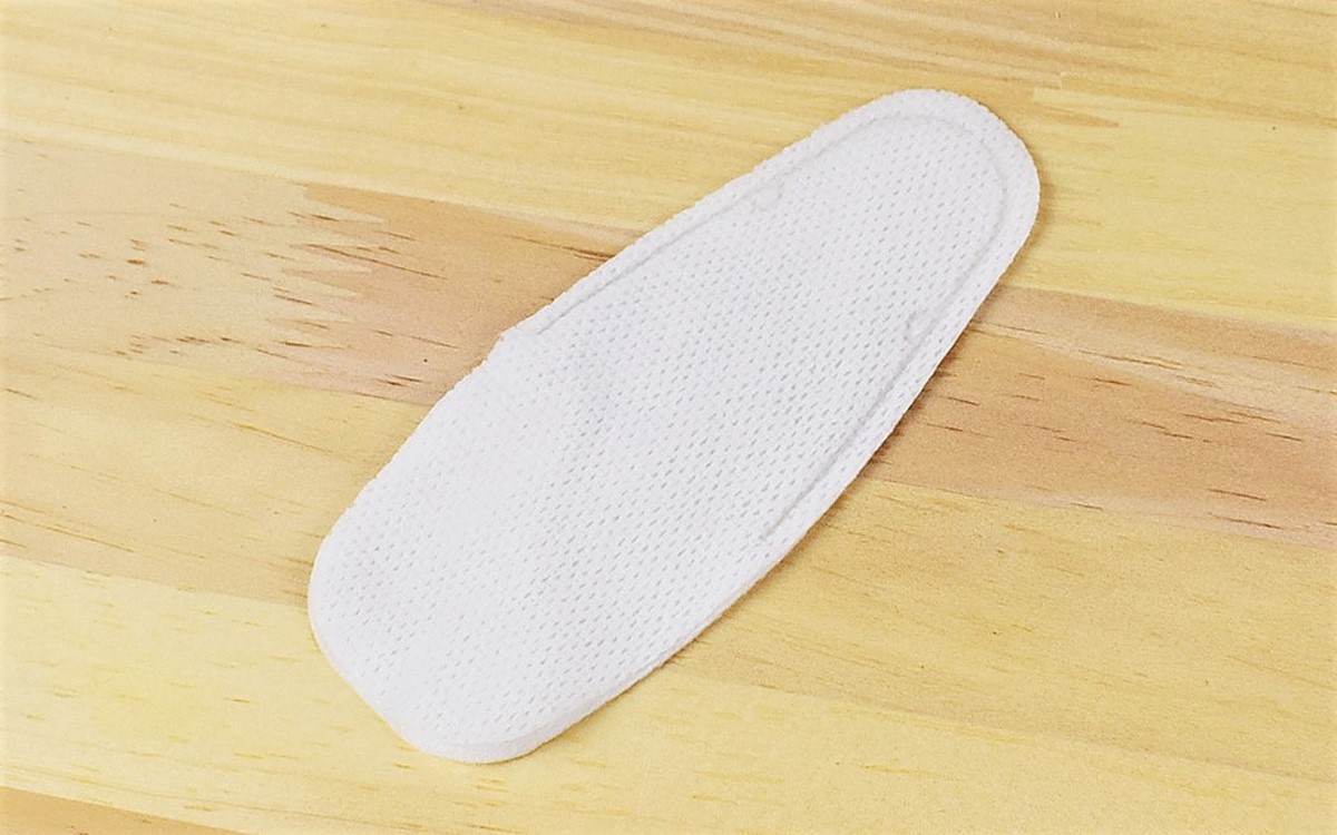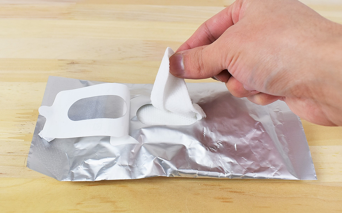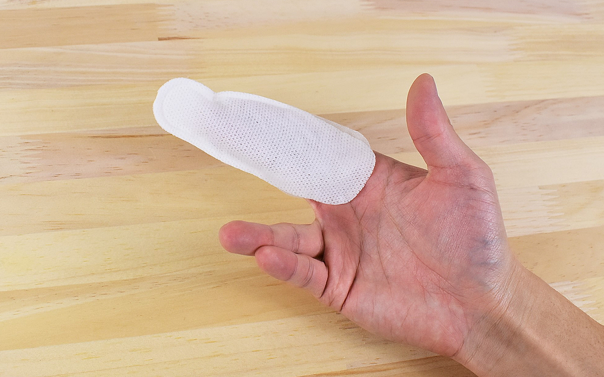 シートは上半分が筒状になっていて、指に装着できる形状。荒い目のガーゼと細かい目のガーゼが4層に重なっているため、両面が2層ずつになるよう真ん中に指を入れましょう。