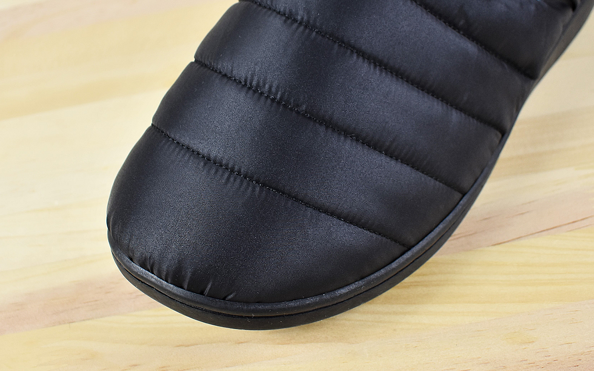 同商品は、ナイロン素材の生地に覆われたふわふわのサンダル。インソールにも起毛生地が使用されていて、まるで冬用アウターのようなデザインが特徴的です。豊富なカラーバリエーションの中から、今回はどんなコーデにも合わせやすいブラックをチョイス。表面はなめらかなセミマットで、大人びた印象を受けます。